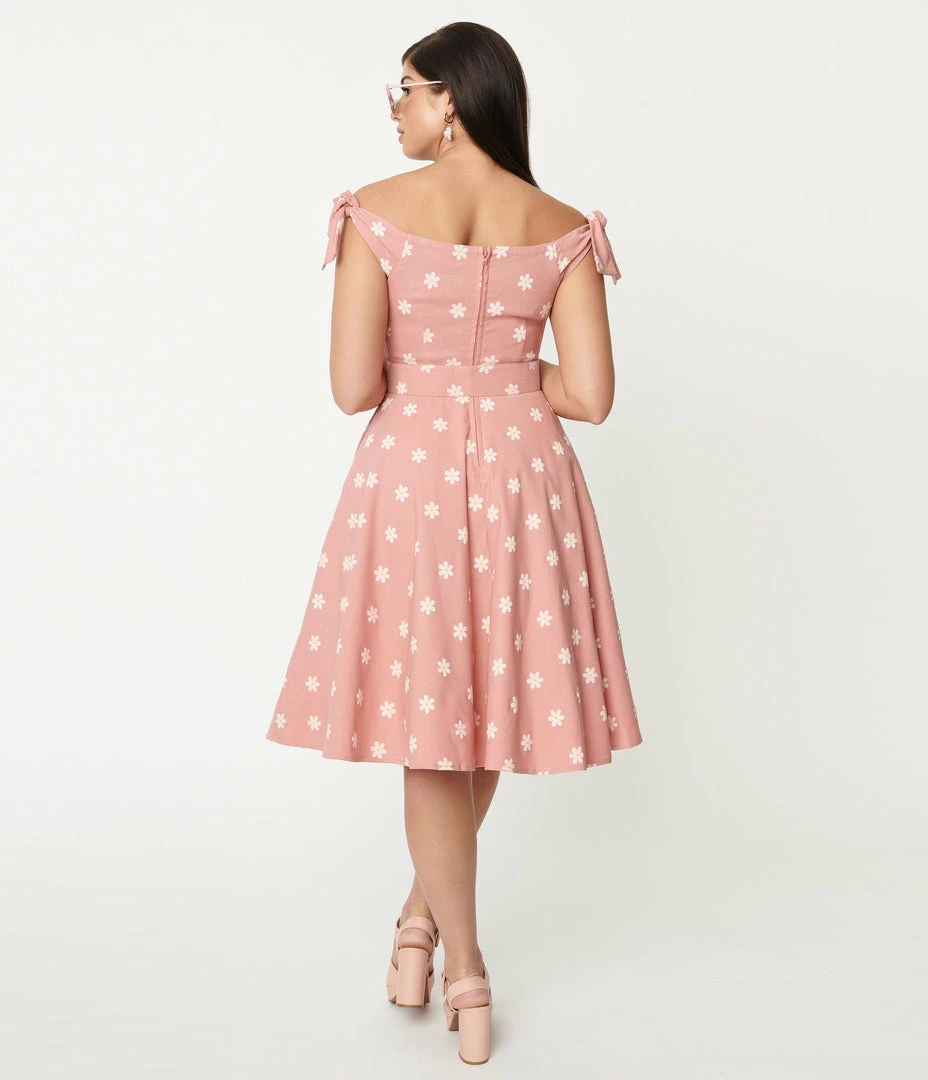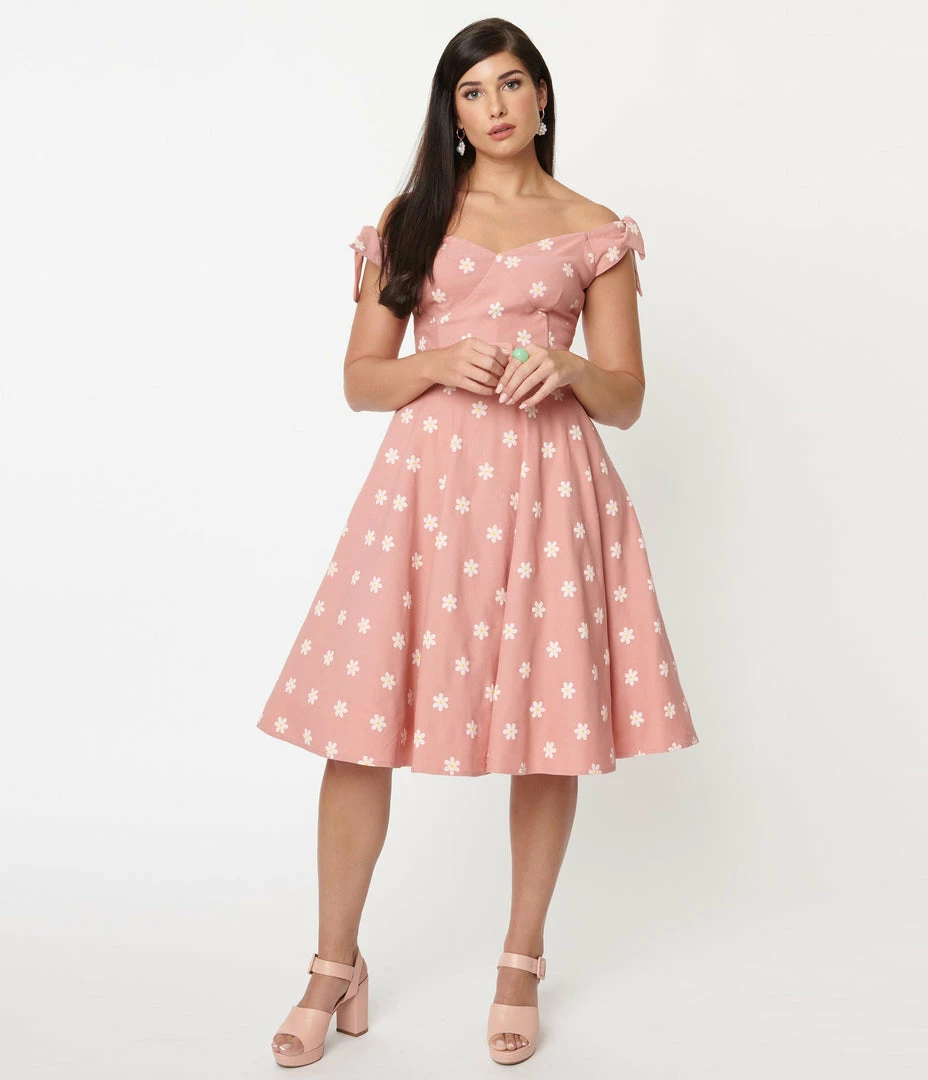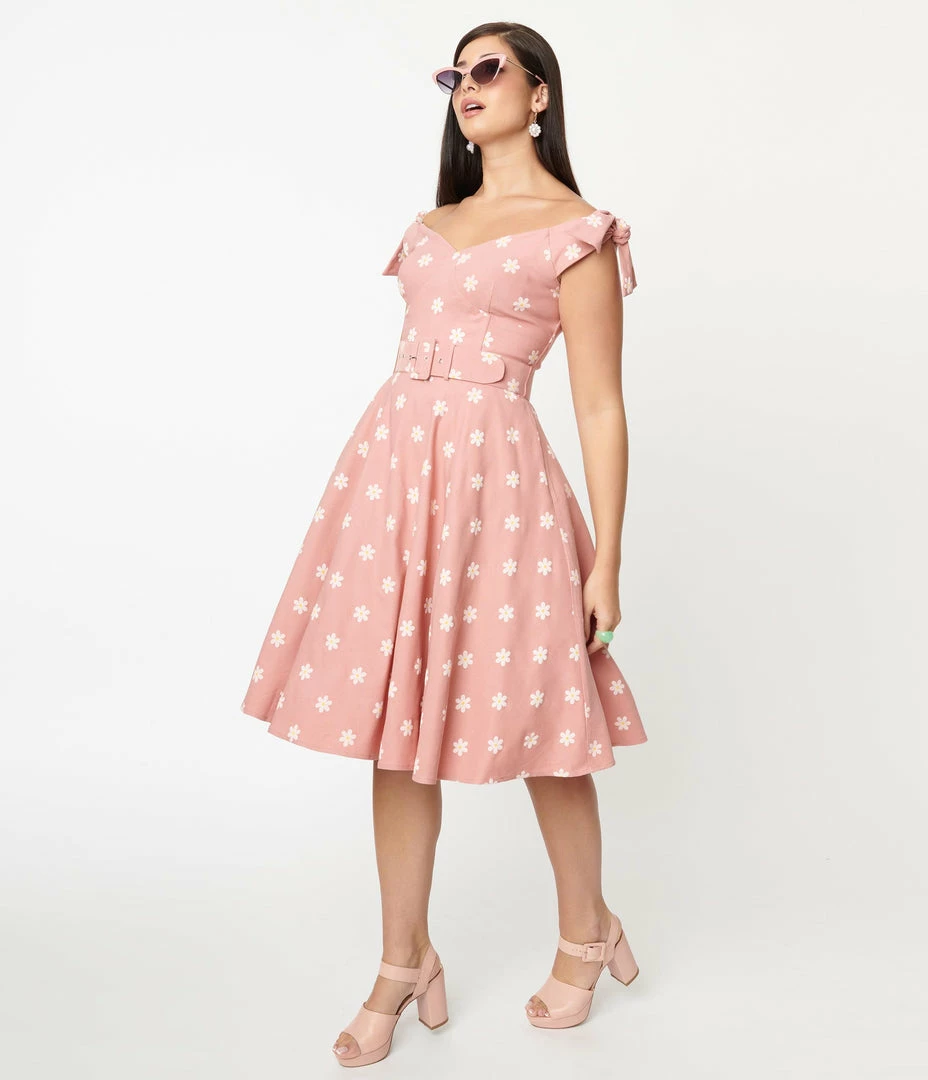 Make memories to last, gals! Watch them sing your praises in this rockabilly wonder from Unique Vintage. The Prairie Dress is crafted in a marvelous woven stretch blend that flatters your feminine form with white daisies printed throughout a rose pink silhouette. The off the shoulder design features self tie shoulder straps while the seamed bodice is structured with subtle boning and cinched with a wide belt and back zipper to highlight your hourglass. Outfitted with a sweeping swing skirt and complete with side pockets for modern function!