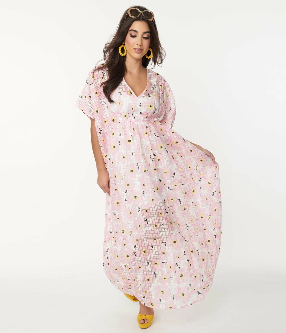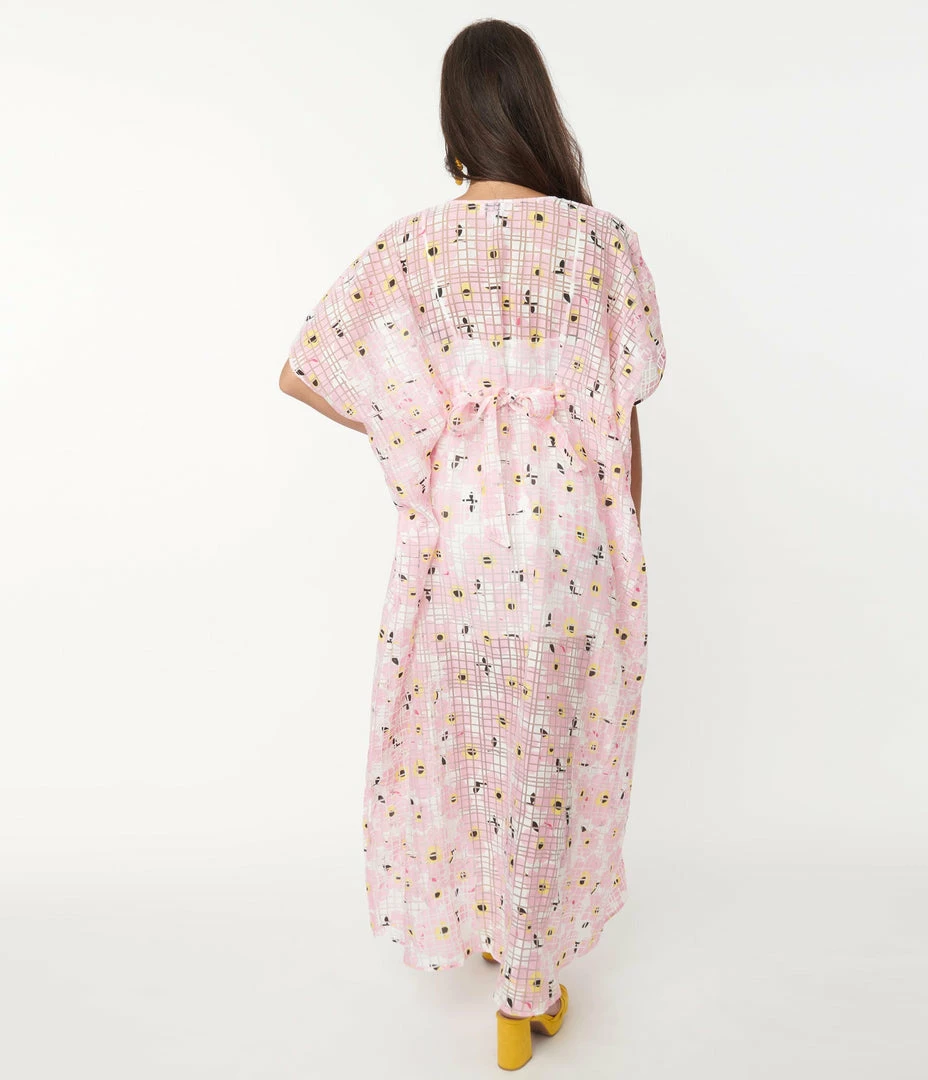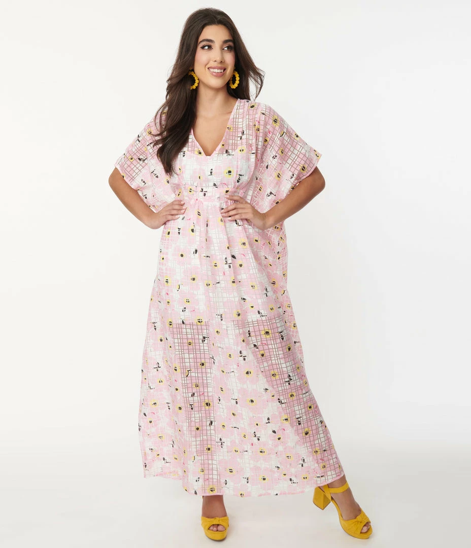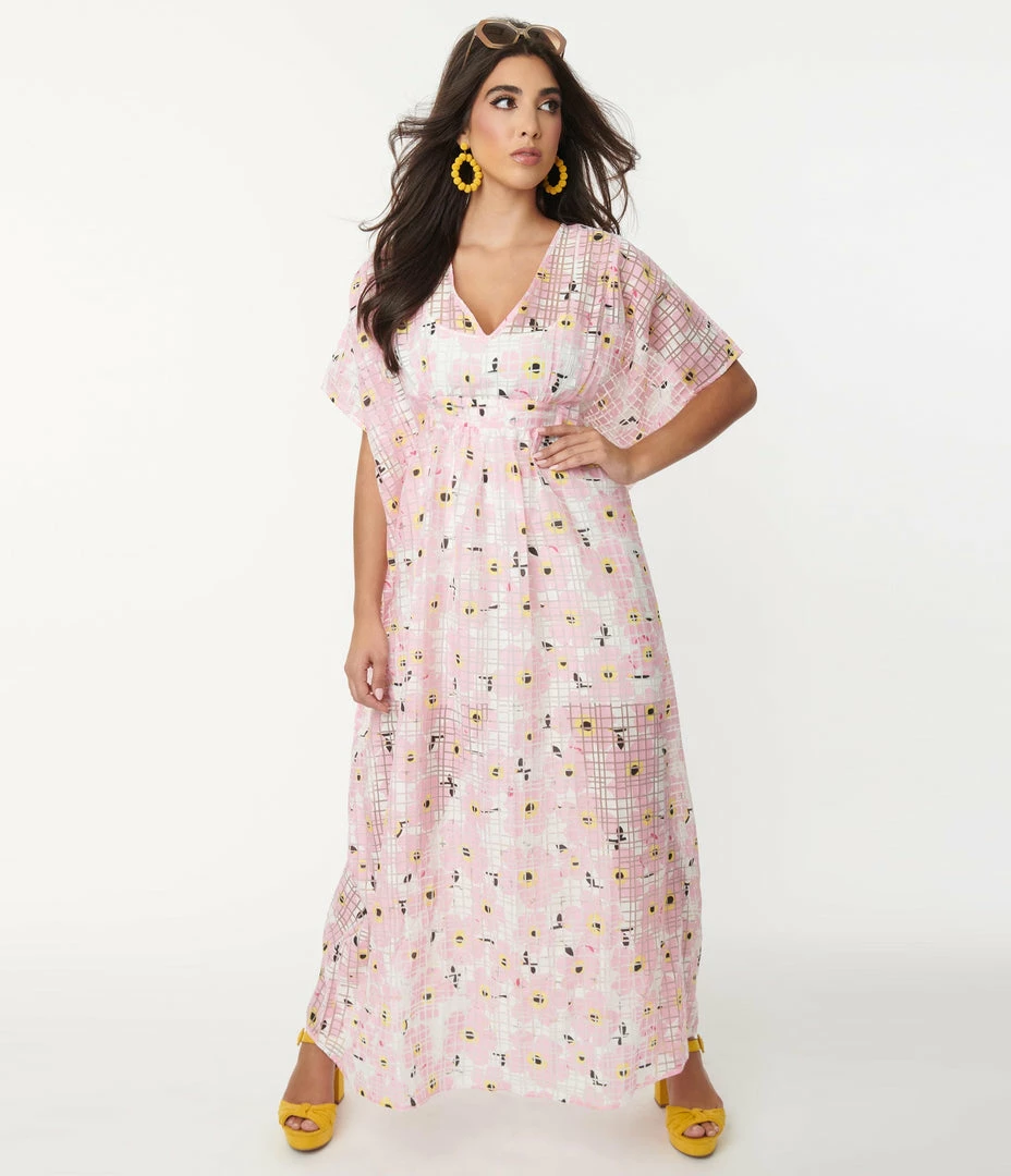 Stay fabulous in this dreamy caftan frock crafted in a sheer burnout chiffon style that dances with blooming pink florals that cascade through the white backdrop of this 1970s style silhouette. The sultry V-neckline is framed by sweeping half sleeves and is nipped in the waist with self ties for a marvelous fit.