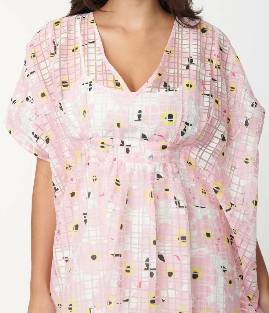 New ๐ Unique Vintage Pink Floral Burnout Chiffon Burton Caftan ๐ Dress Swimwear ๐คฉ