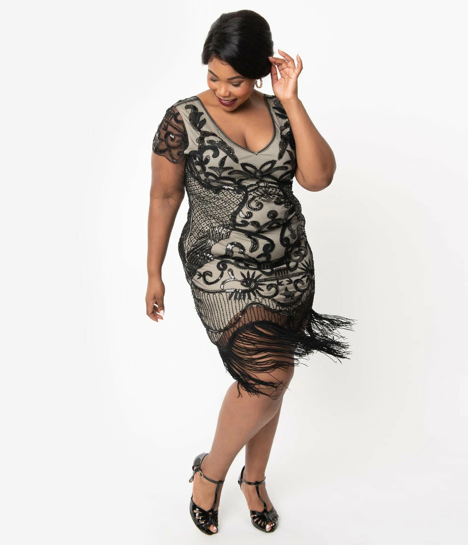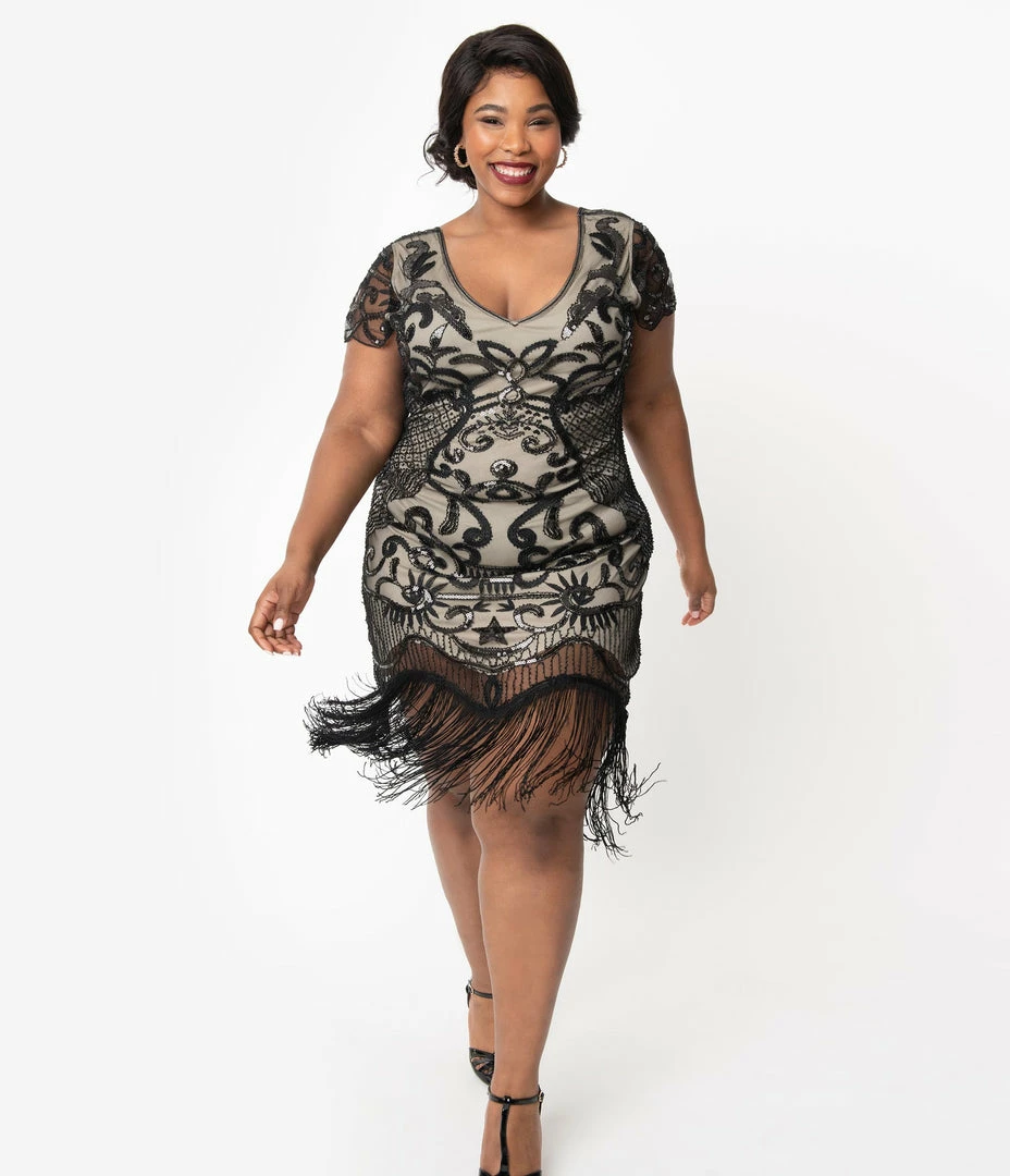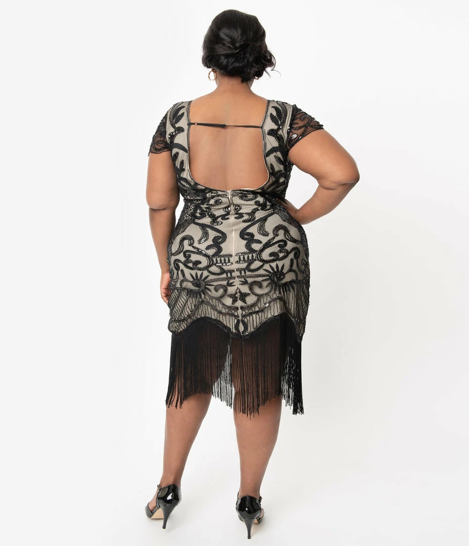 Aurore is a noble delight, dolls! Beaded and fancy free, this beautiful plus size 1920s style dress from Unique Vintage, the Aurore Flapper is a marvel in deco divinity. Black mesh over beige lining boasts a delightful array of gleaming dark colored glass beads, black sequins, and black embroidery in fabulous deco designs. Graceful scalloped cap sleeves frame your vintage visage while glamorous long fringe dances around your knees. Outfitted with a back zipper and an adjustable back strap that secures your sleeves, Aurore is meant to love and be loved!