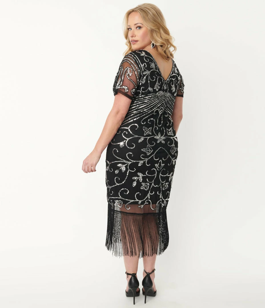 Enthrall the room in vintage style, dames! This elegant 1920s inspired plus size cocktail dress from Unique Vintage is a deco divine flapper full of sparkling accents. The Troyes Dress is a gorgeous silhouette for a romantic affair with a black knit lining featuring an overlay of black mesh and twinkling with silver sequins and beading that swirl throughout. The ravishing V-neckline is framed by sweet mesh sleeves while a stunning fitted skirt curves to a straight hem that drips with black fringe past the knees. Outfitted with a side zipper to cinch in your hourglass, we prefer to show our passion in the spotlight!