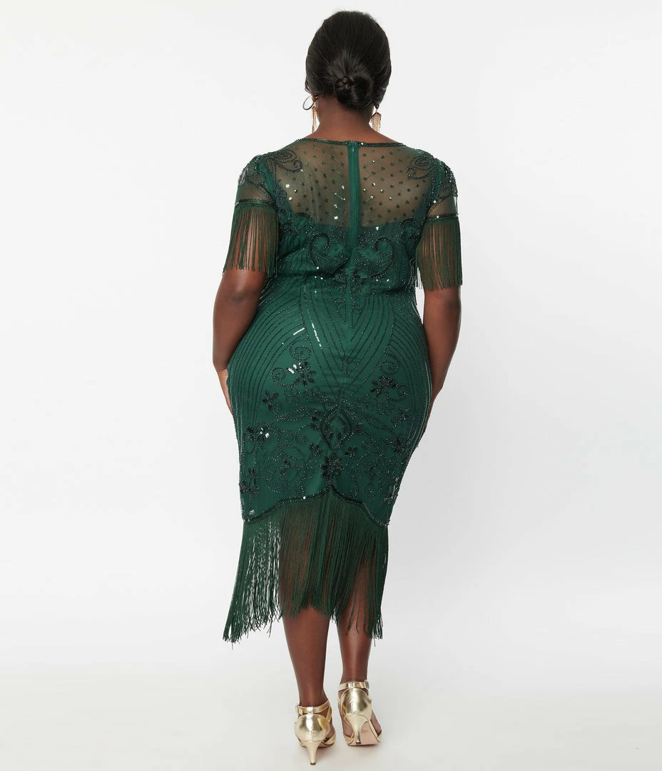 This stunning plus size flapper dress features a dazzling array of green beads and sequins throughout emerald green mesh and lining. Complete with short sleeves, fringe, and a back zipper.