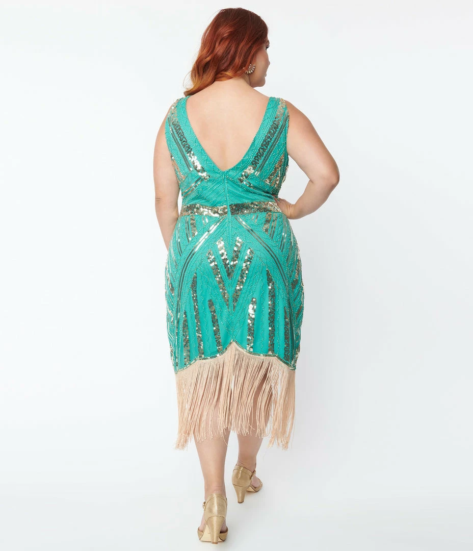 This dynamic plus size flapper dress is crafted in a beautiful turquoise mesh that shimmies with golden sequins and beading over turquoise lining. The sultry V-neckline and sleeveless design lend an ethereal silhouette while the banded waist is cinched with a back zipper. The fitted skirt drop into long beige fringe that sweeps past the knees!