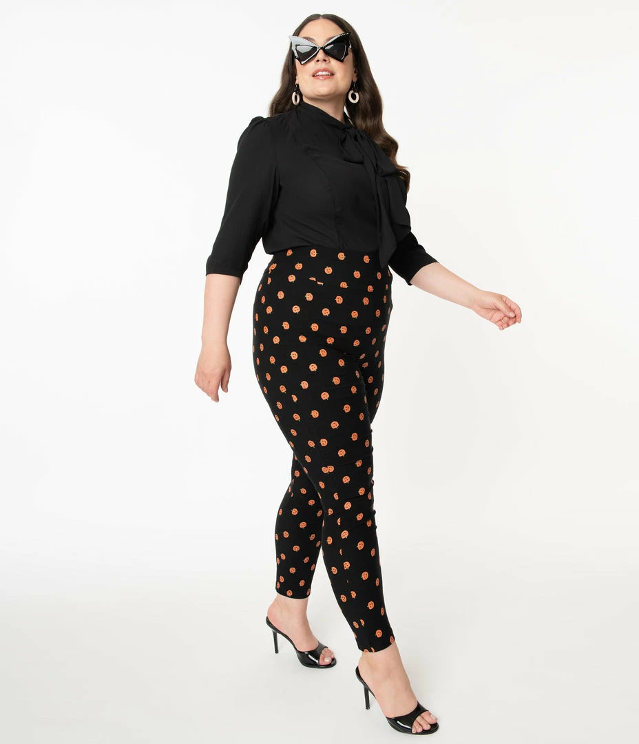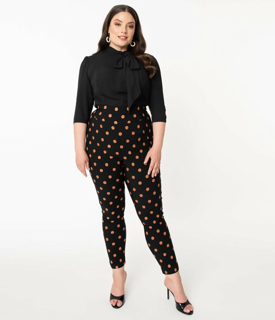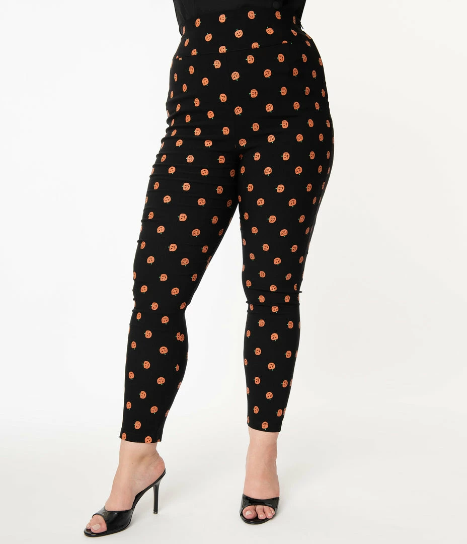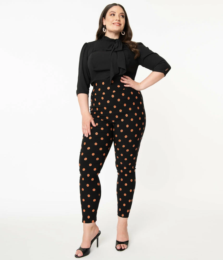 Glorify your gourds, ladies! Full of sass and class, the plus size Rizzo Pants from Unique Vintage are crafted in a fabulous stretch fabric that flatters your feminine figure in a sultry black and dance with orange pumpkins printed throughout. The dramatic high waist slims and elongates your form as the cigarette skinny leg glides to your ankles, complete with a side zipper to nip in your pin-up silhouette. Eat your heart out!