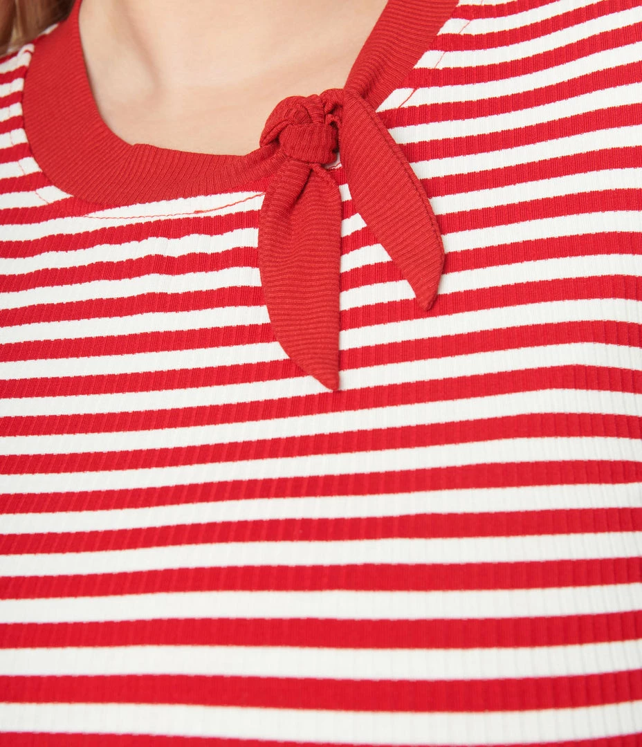 This sweet plus size top is crafted in a ribbed knit in red and white stripes. Complete with attached neck ties.