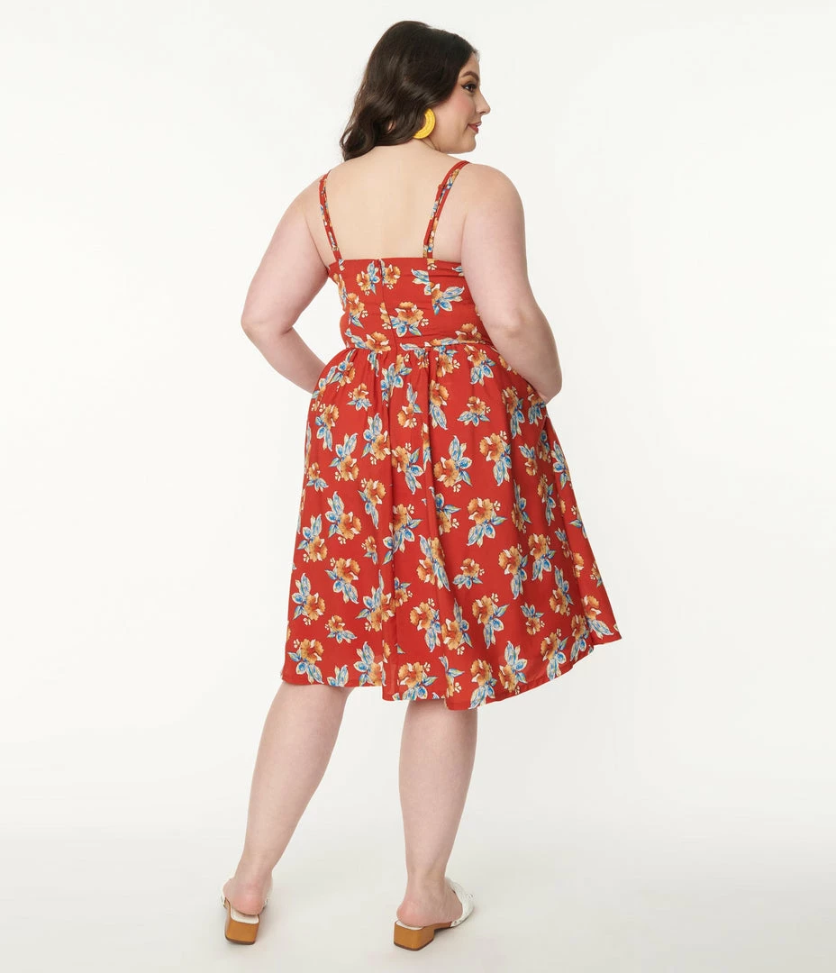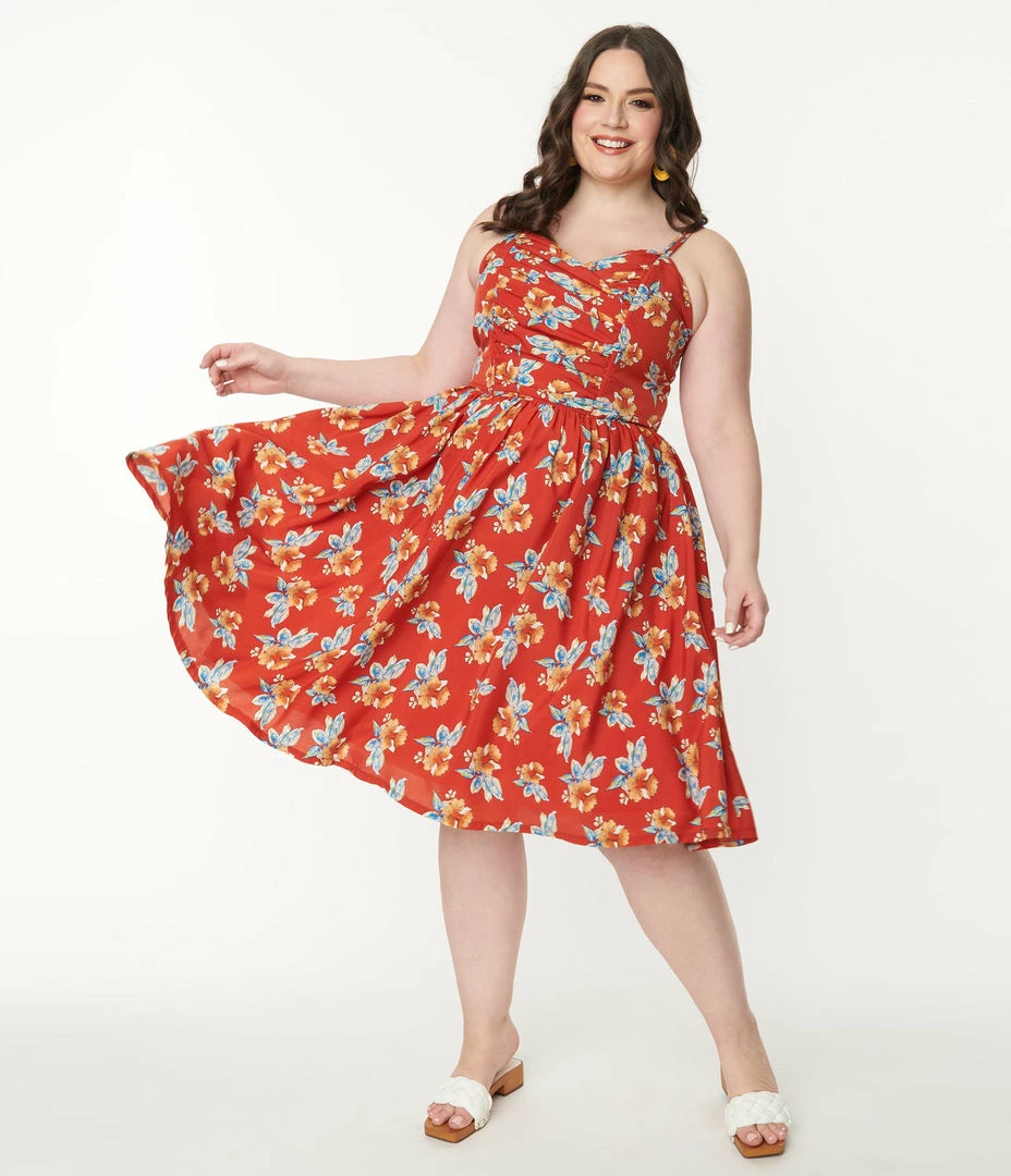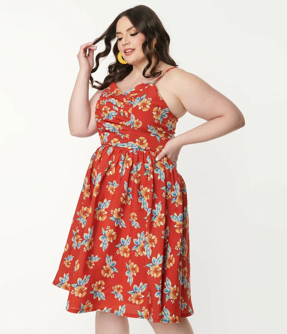 This dreamy plus size mid-century inspired piece is crafted in a lightweight rist red woven fabric that dances with orange, ivory, and blue florals throughout. The sweetheart bodice is secured with adjustable spaghetti straps while the seamed waist is cinched with a back zipper. The gathered swing skirt cascades to your knees while full lining lends comfort for all day wear!