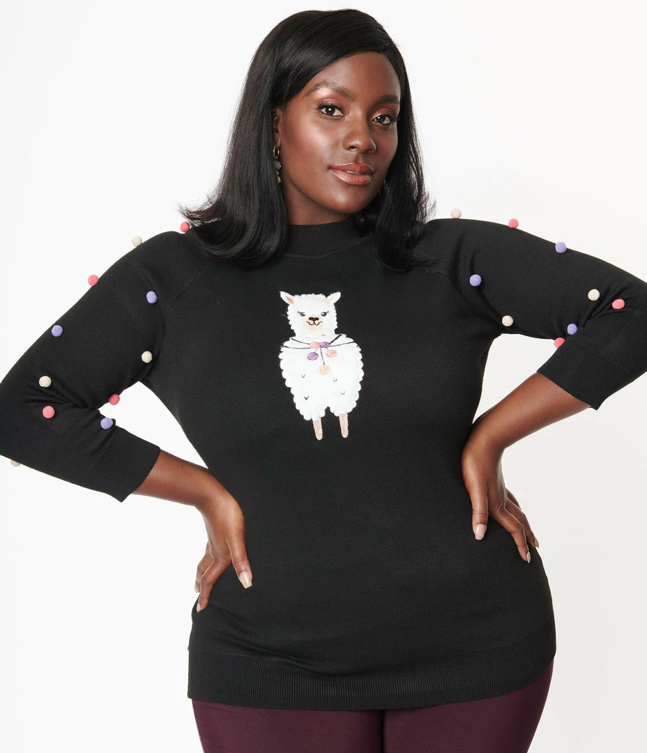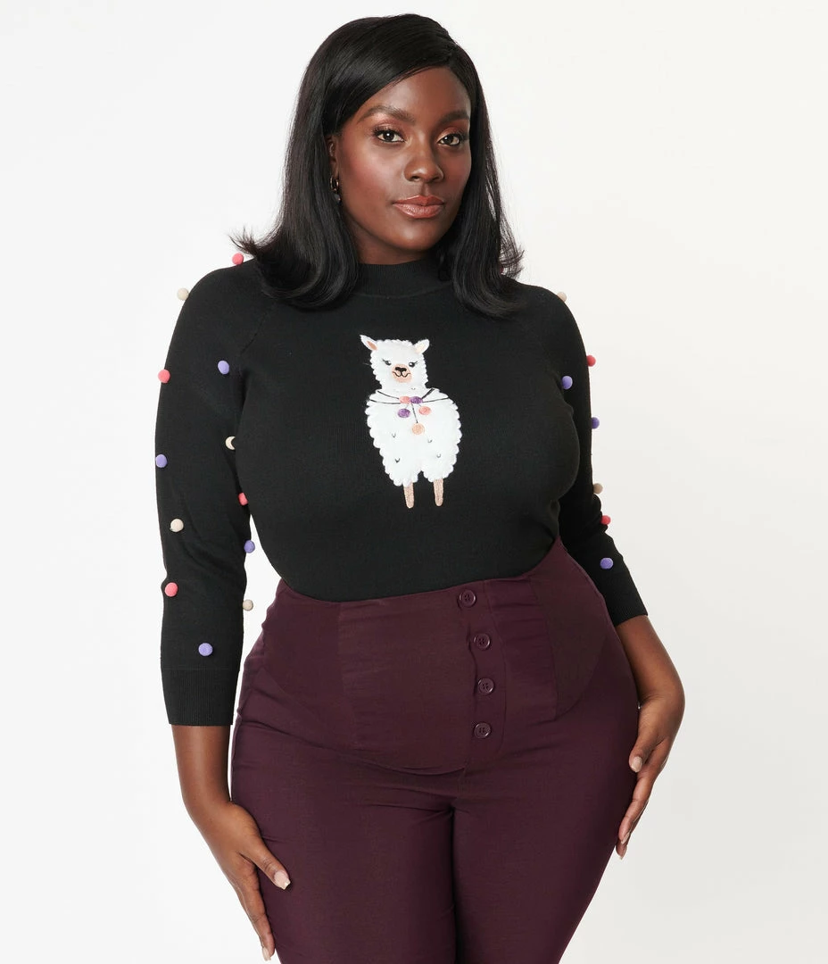 You’re a perfect match, dear! An enchanting plus size sweater from Unique Vintage, the Autumn Sweater is a cozy separate, boasting a darling fuzzy white alpaca patch on the front and adorable poms poms on the sleeves. Crafted in a soft black knit, the high neckline and three-quarter length sleeves keep you warm while frolicking through the mountains!