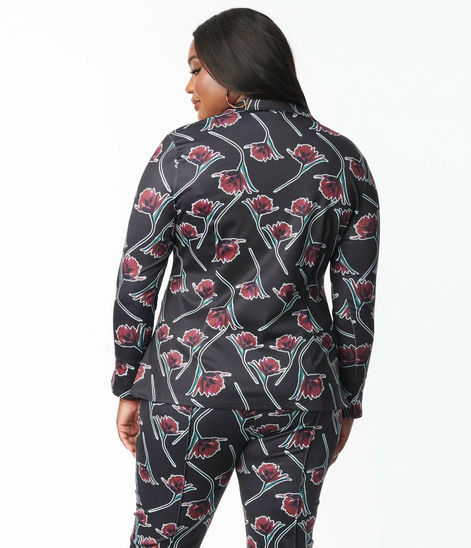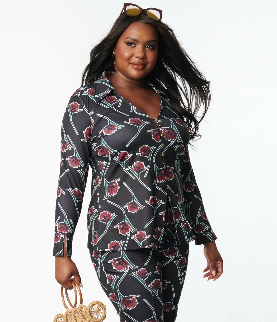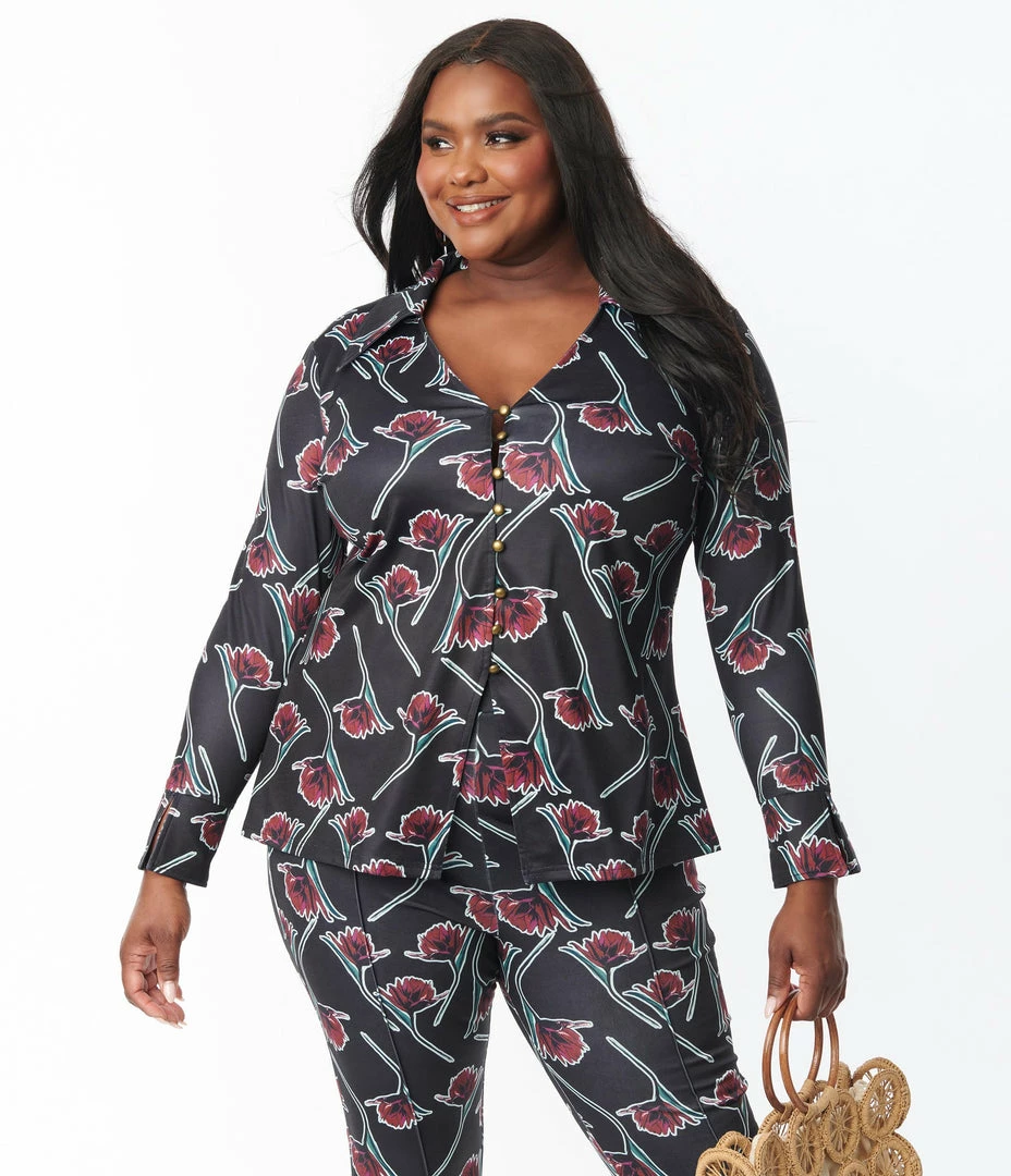 Wholesale 🌟 Unique Vintage Plus Size Black & Burgundy Floral Print Blouse 💯