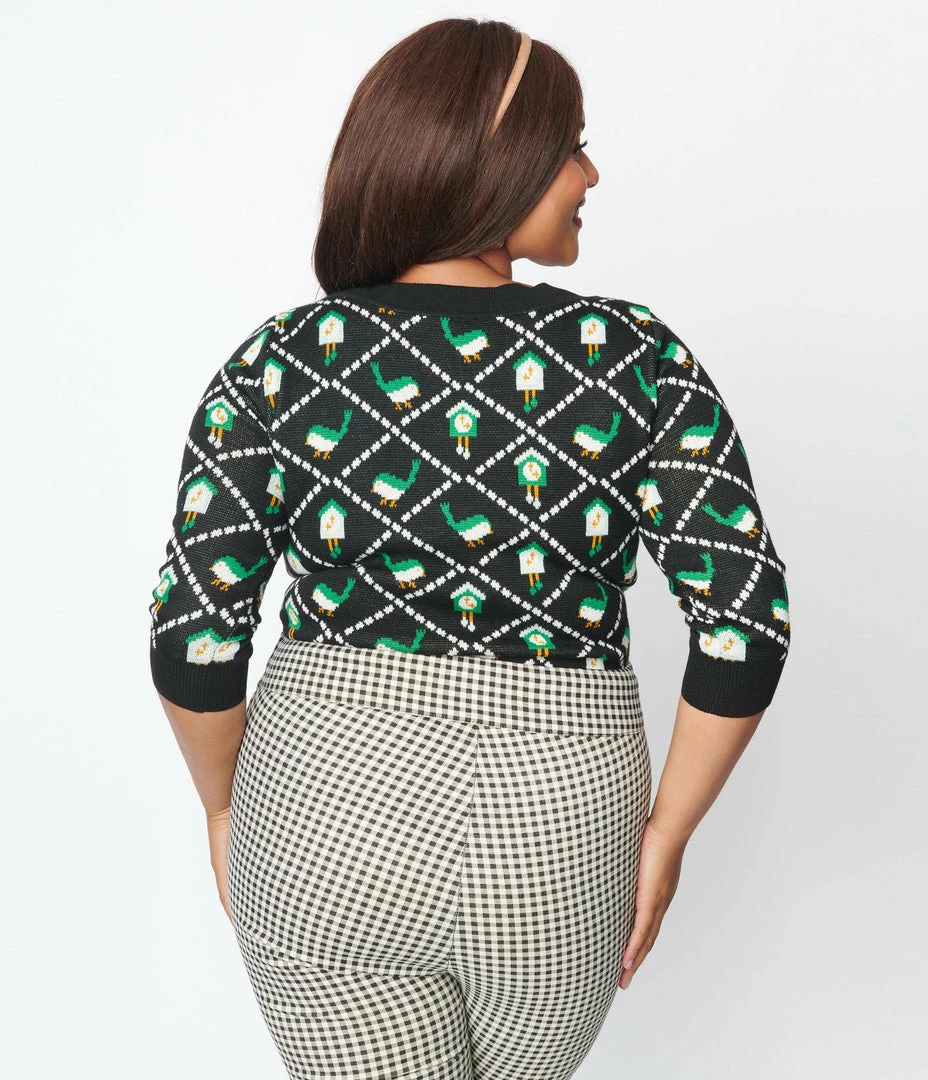 This sweet plus size knit sweater is crafted in a soft knit black fabric that features green birds and cuckoo clocks in a diamond pattern. Complete with three-quarter length sleeves.