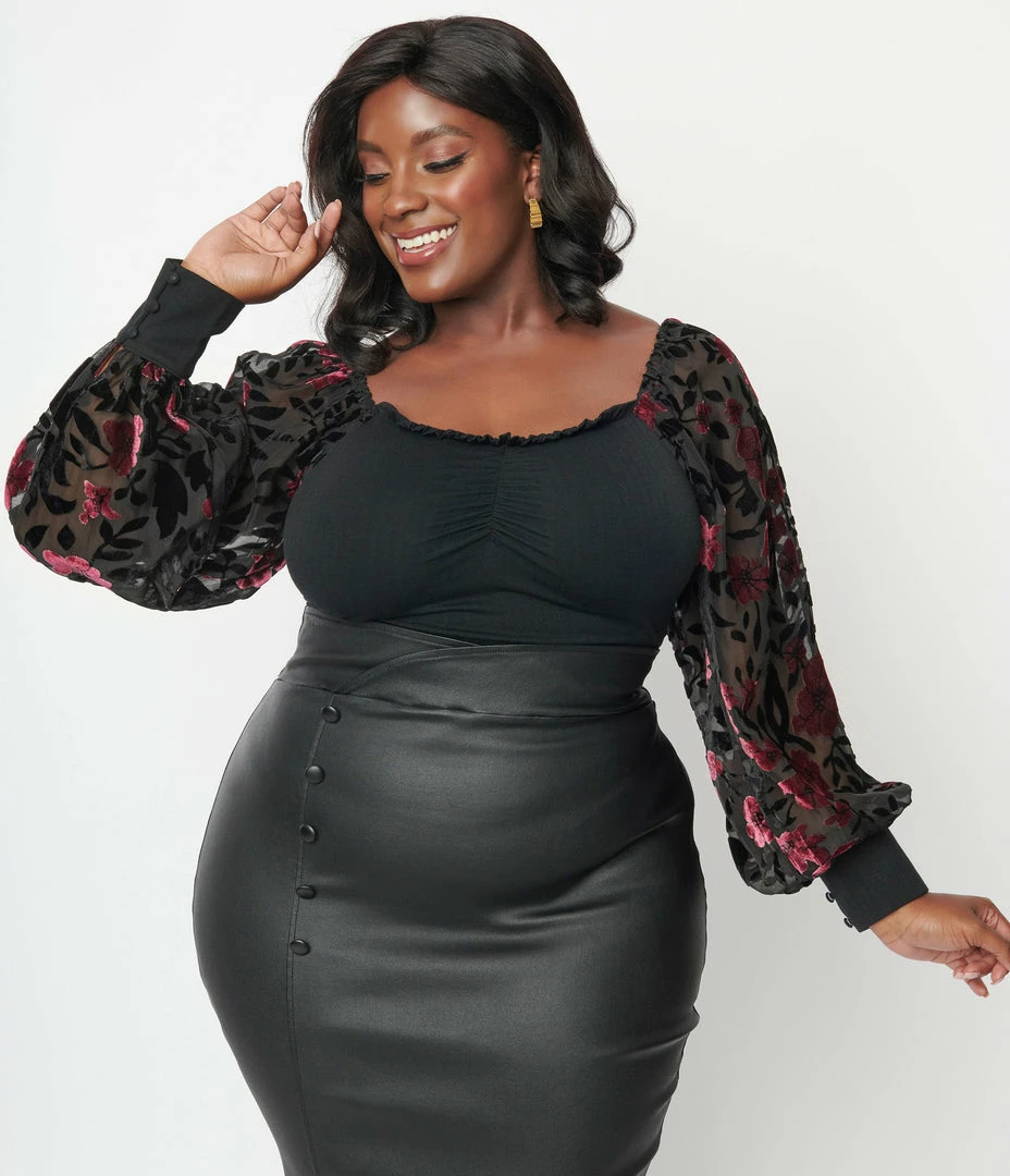 Best Pirce ๐ Unique Vintage Plus Size Black & Floral Burnout Sleeve Bodysuit New Arrivals! ๐งจ