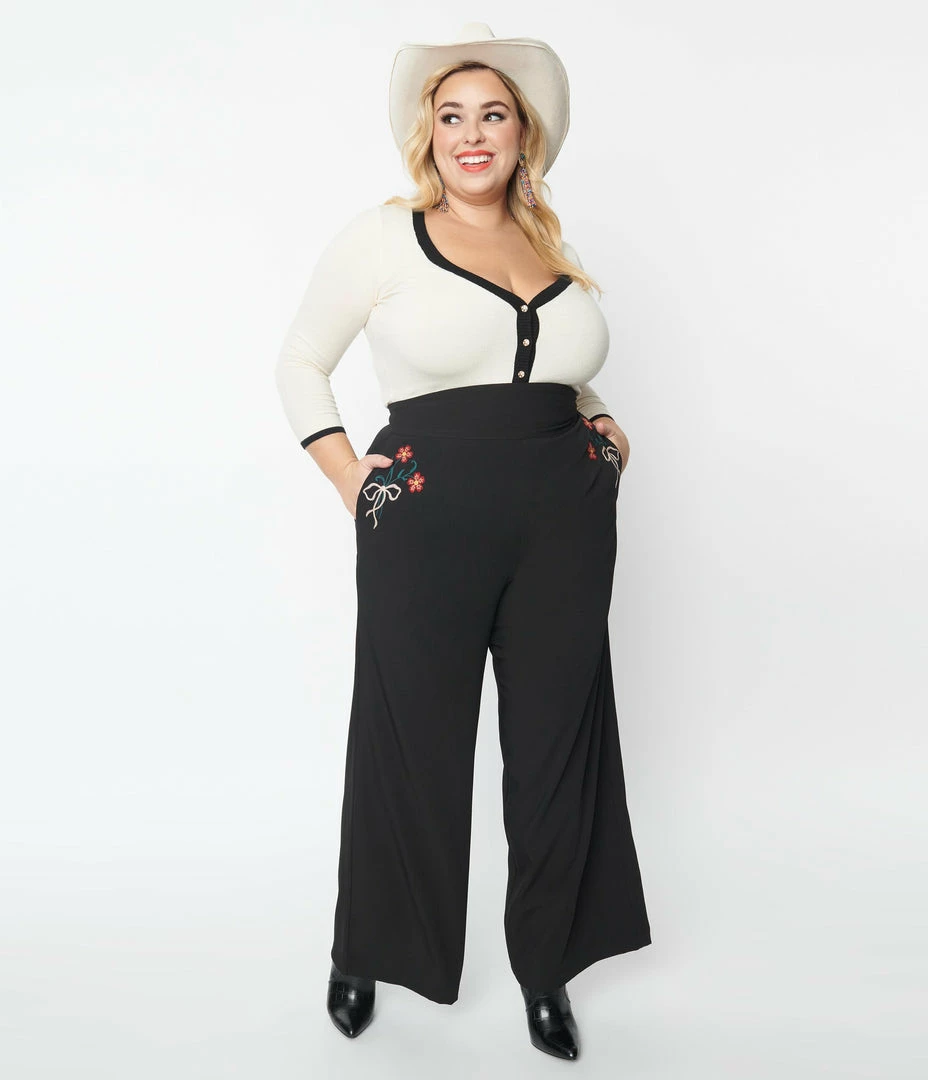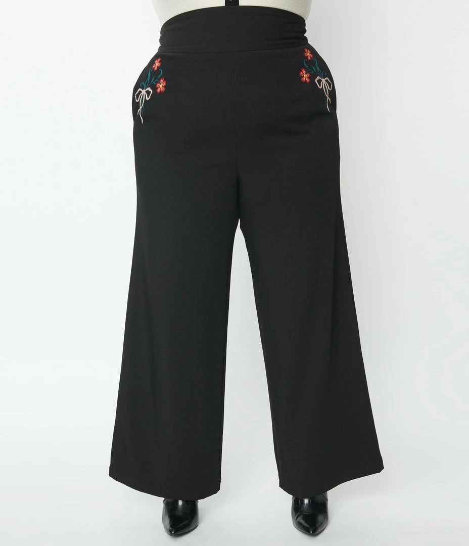Brand new โจ Unique Vintage Plus Size Black & Floral Embroidery High Waist Pants Clothing ๐งจ