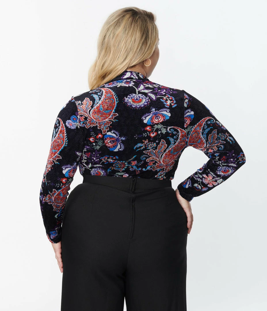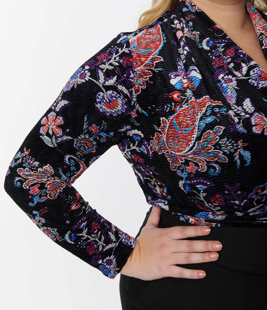 This alluring plus size black and multicolor paisley floral bodysuit is crafted in a soft ribbed velvet and boasts a sultry gathered V-neckline, framed by slender three-quarter length sleeves as the snap button closure makes this slimming separate pair easily with your favorite skirt or skinnies!