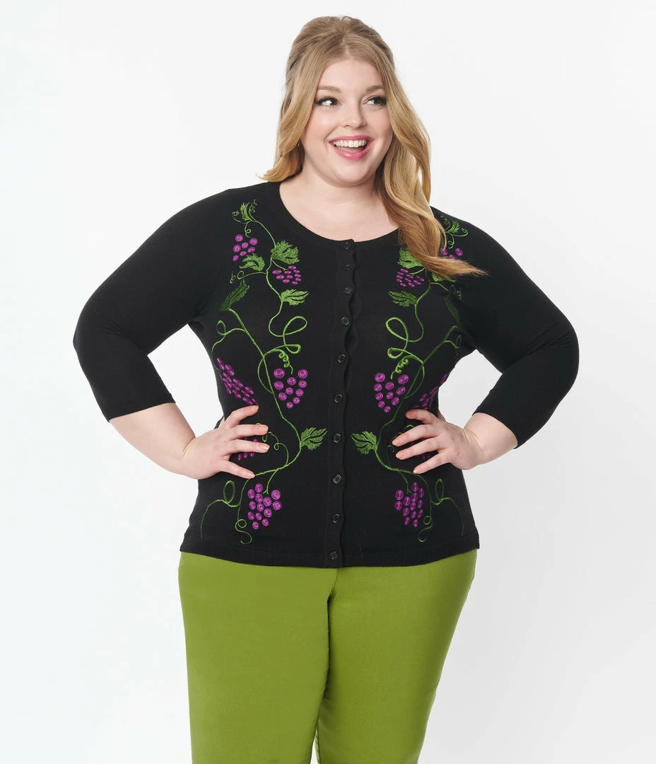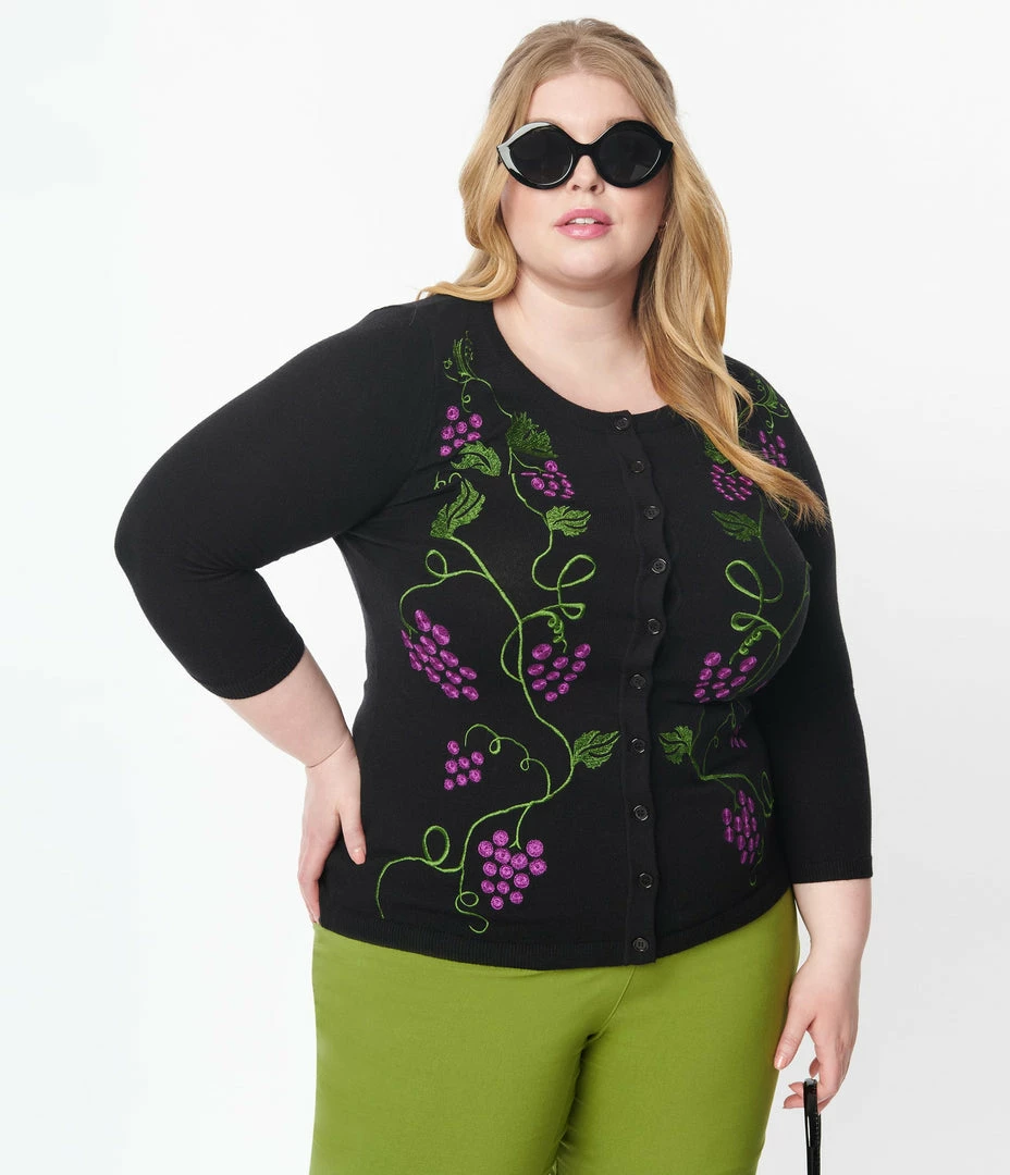 This soft plus size black knit cardigan features adorable purple embroidered grapes dancing throughout while the button up front leads to a modest scoop neckline while the three-quarter length sleeves provide enchantment!
