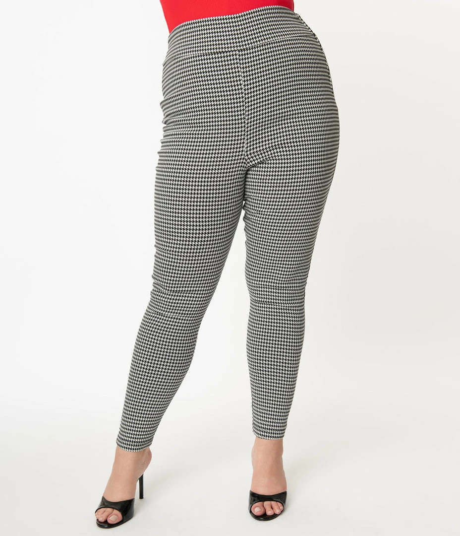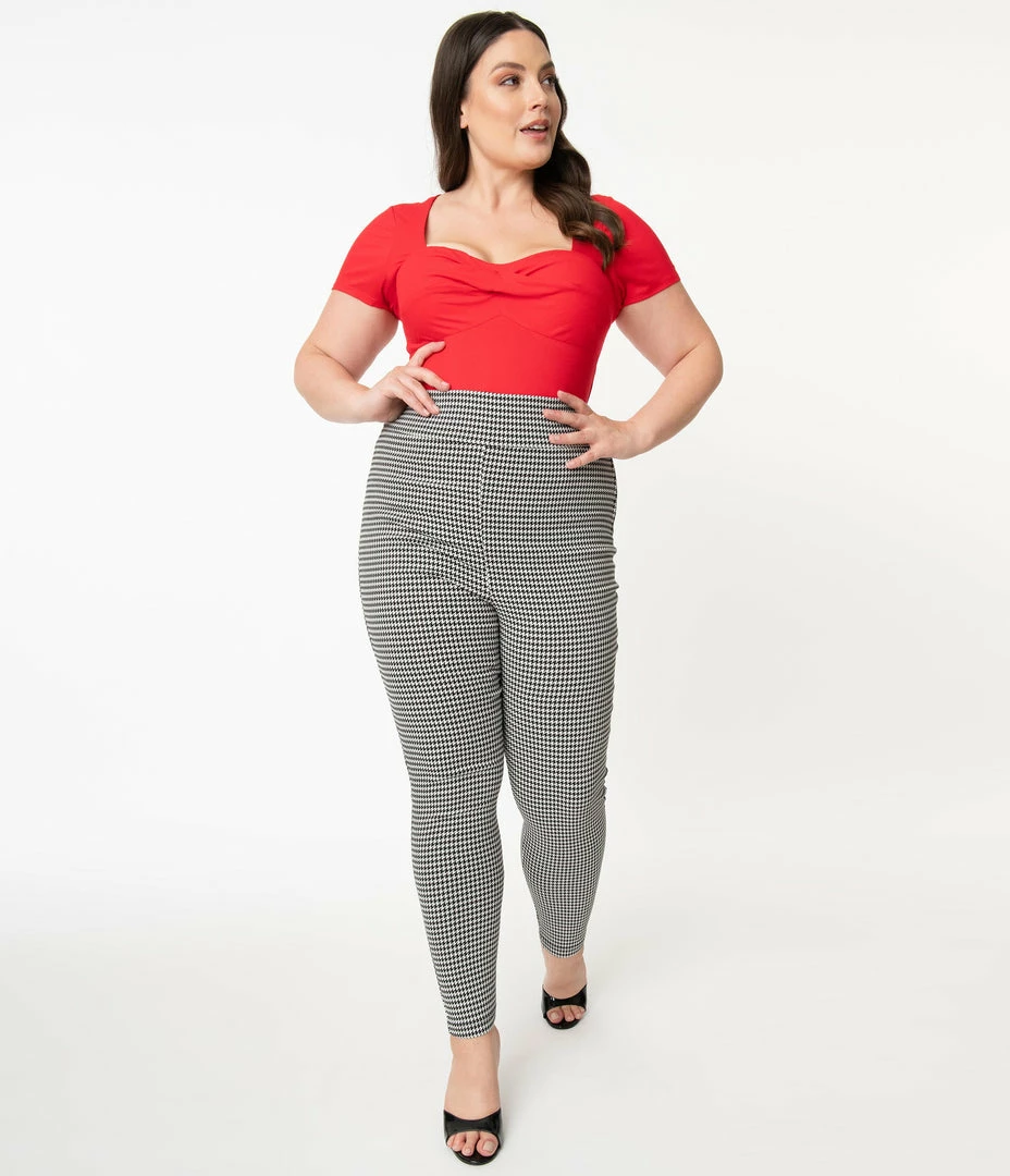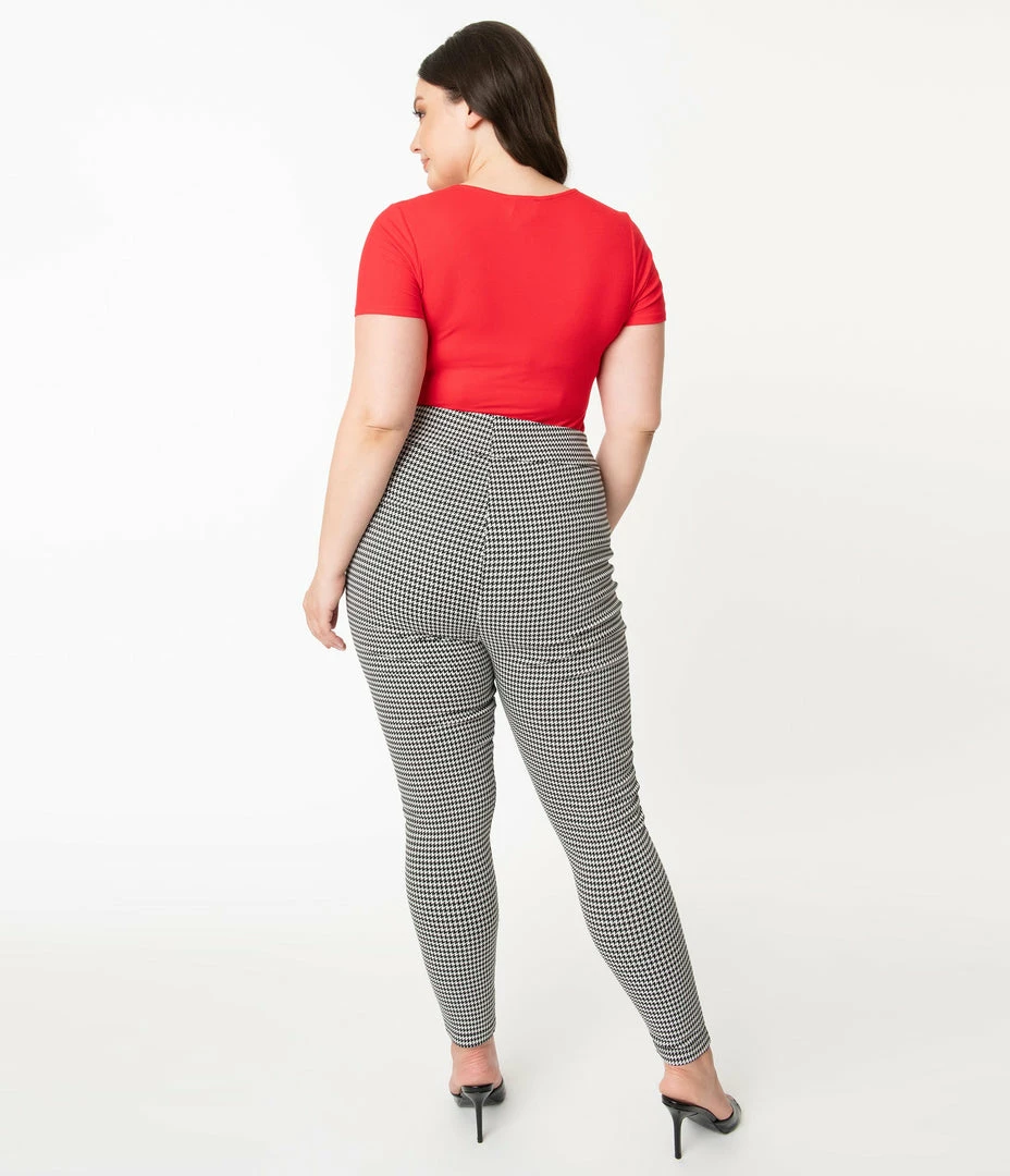 Glorify your gams, ladies! Full of sass and class, the plus size Rizzo Pants from Unique Vintage are crafted in a fabulous black and white houndstooth stretch fabric that flatters your feminine figure as you saunter into view. The dramatic high waist slims and elongates your form as the cigarette skinny leg glides to your ankles, complete with a side zipper to nip in your pin-up silhouette. Eat your heart out!
