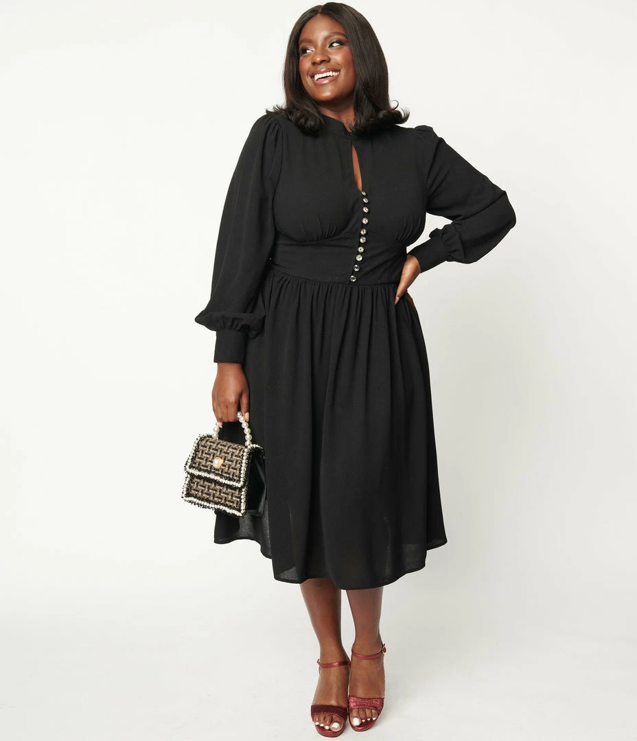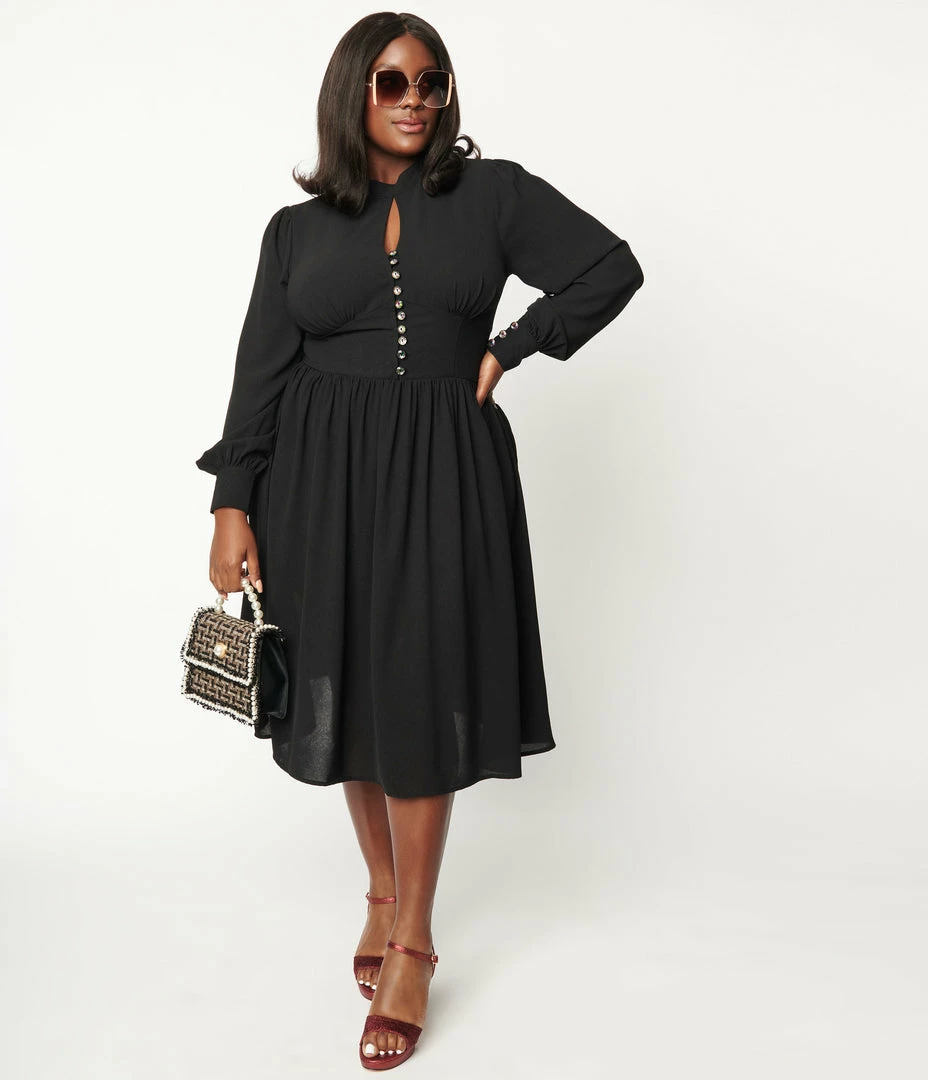 This charming plus size swing dress is crafted in a fabulous black crepe fabric. The high neckline accents the sultry keyhole bodice, which leads to a partial button up front, framed by long sleeves, while the swing skirt dances below your knees.