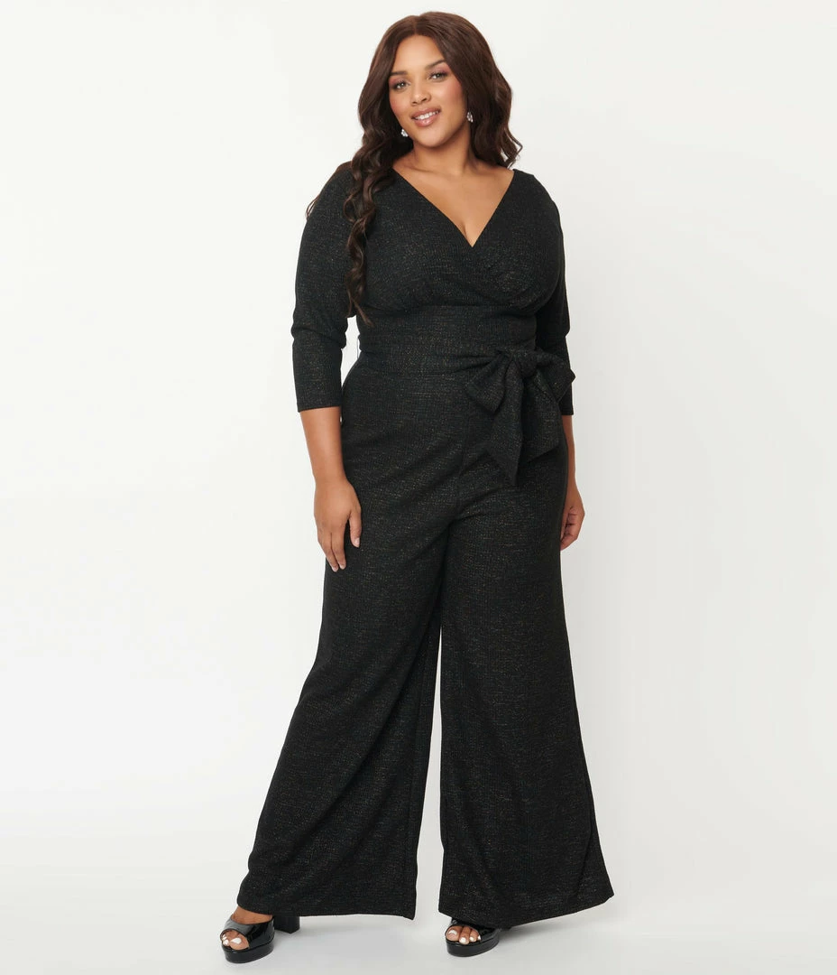 You play the game so well, darling! A shimmering star of the evening, the plus size Gloria Jumpsuit is an astonishing silhouette from Unique Vintage. Crafted in a flattering black marled knit blend that shimmers with metallic threading, the sexy surplice neckline is framed by slender three-quarter length sleeves while the banded waist cinches your hourglass for vintage feminine form. Complete with a back zipper and sash to nip in your figure, make โem see stars!