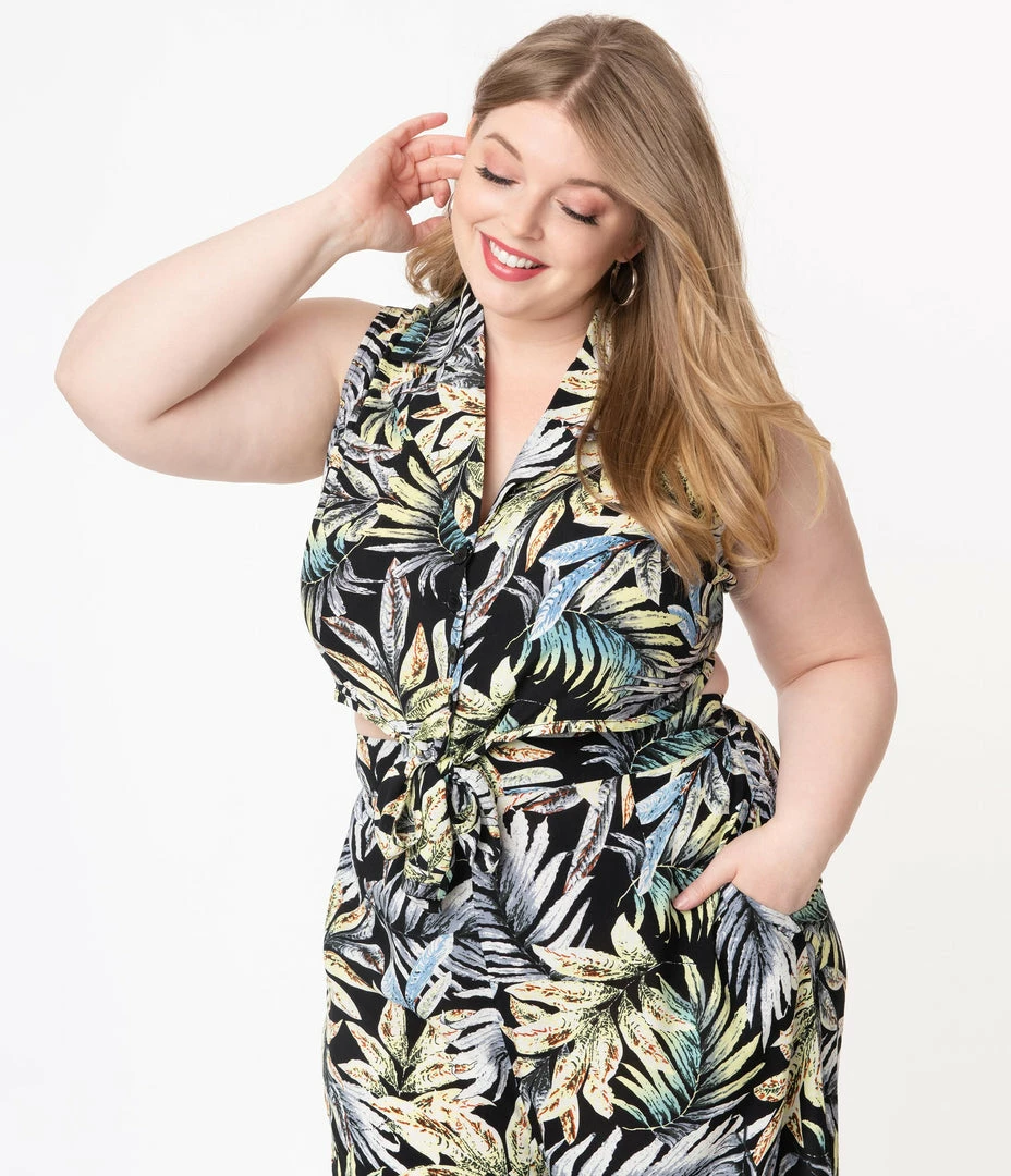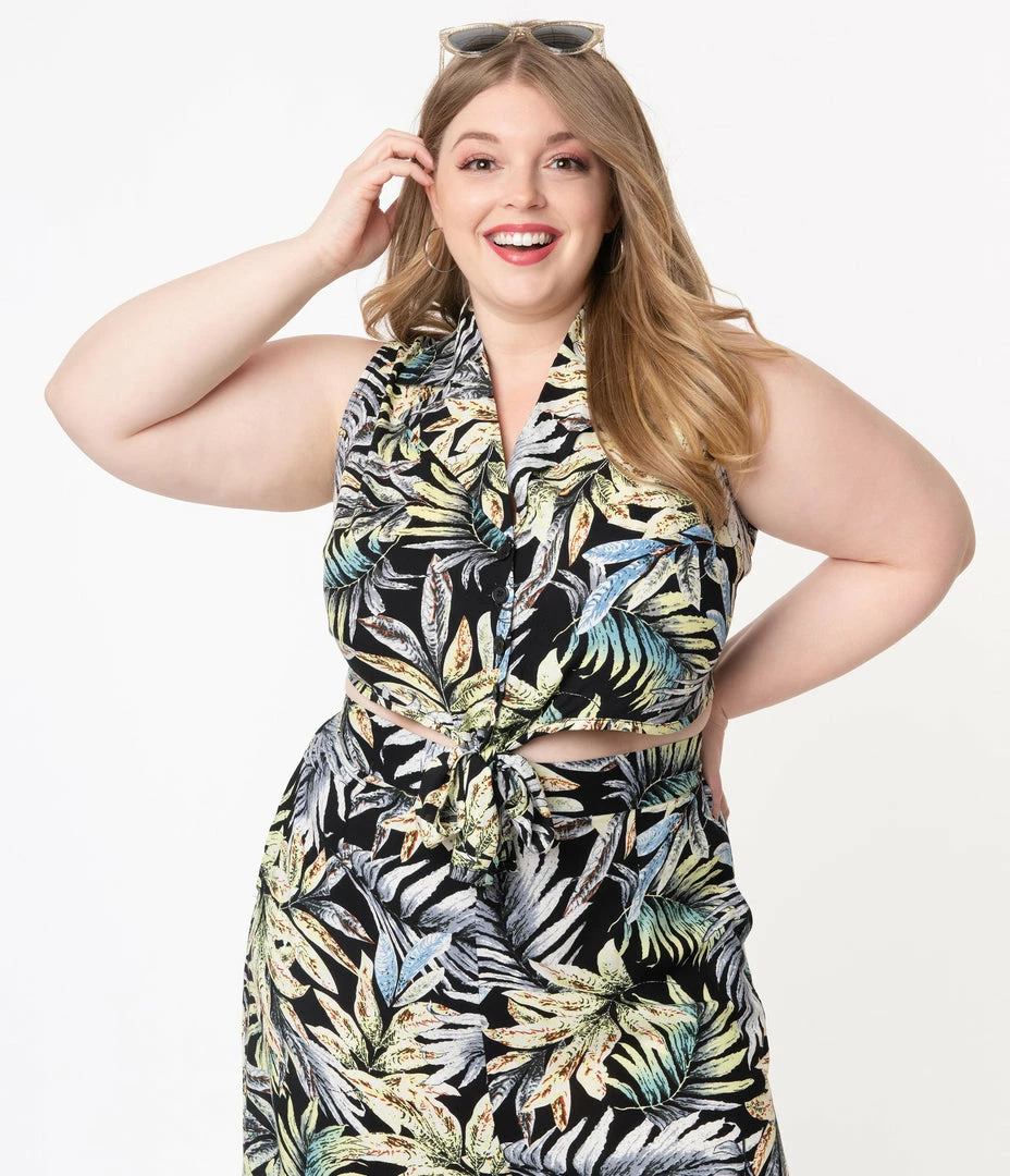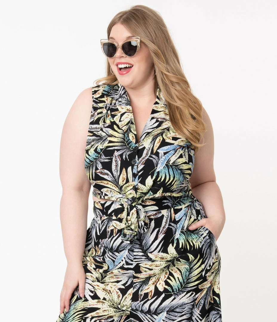Get the beach craze started, darling! This sweet plus size button up crop top from Unique Vintage is cast in a beautiful smooth and lightweight fabric, dancing with tropical palm leaves throughout a black backdrop. A fabulous notched lapel and darling chest pocket lend retro accent to this sleeveless separate while the front self tie adds sweet styling to your ensemble. Take the world on vacation!