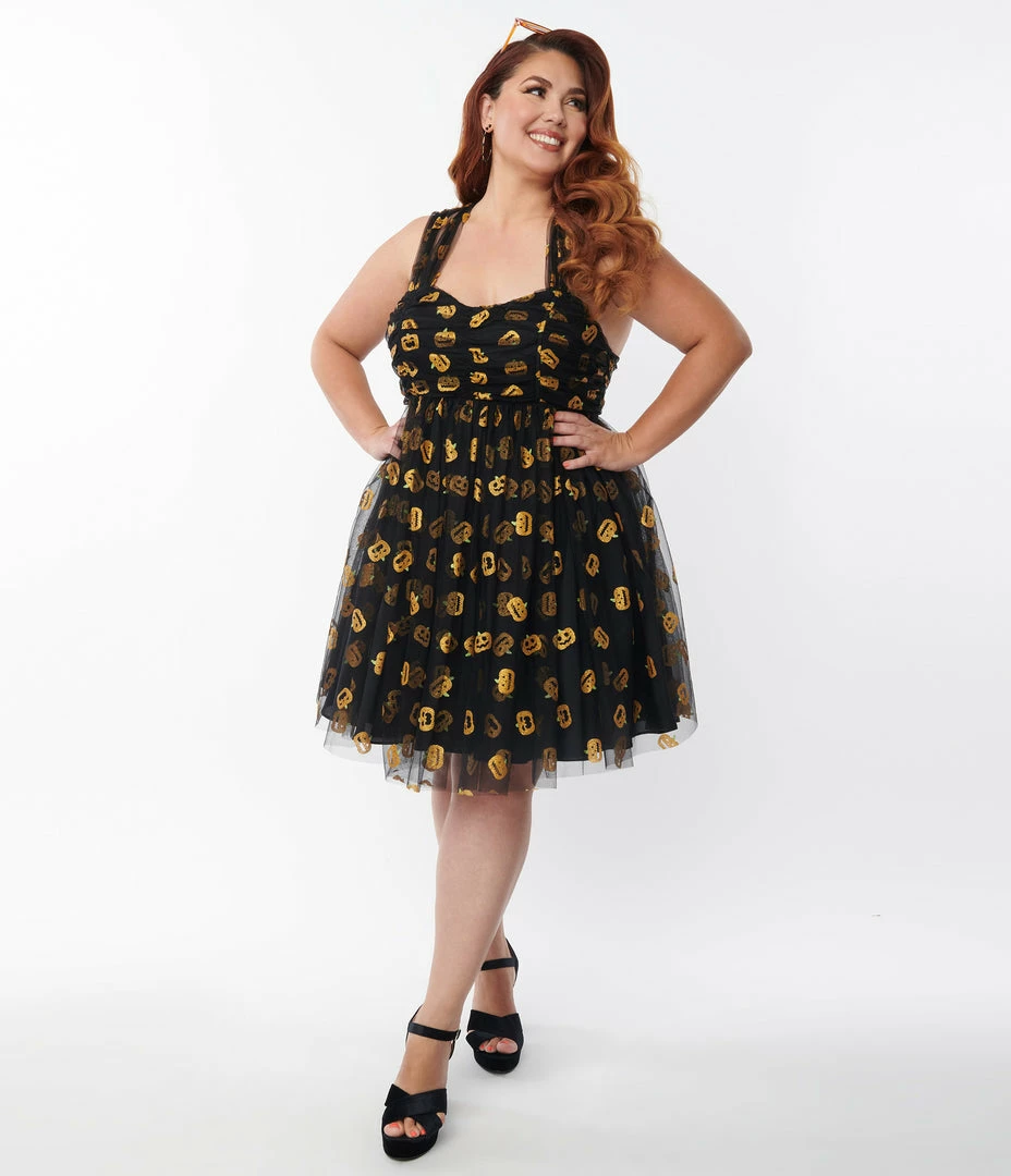 This thrilling plus size babydoll is crafted in a lightweight black mesh with orange glitter printed pumpkins throughout. Outfitted with a sweetheart neckline, padding and boning, a back zipper, and black lining.