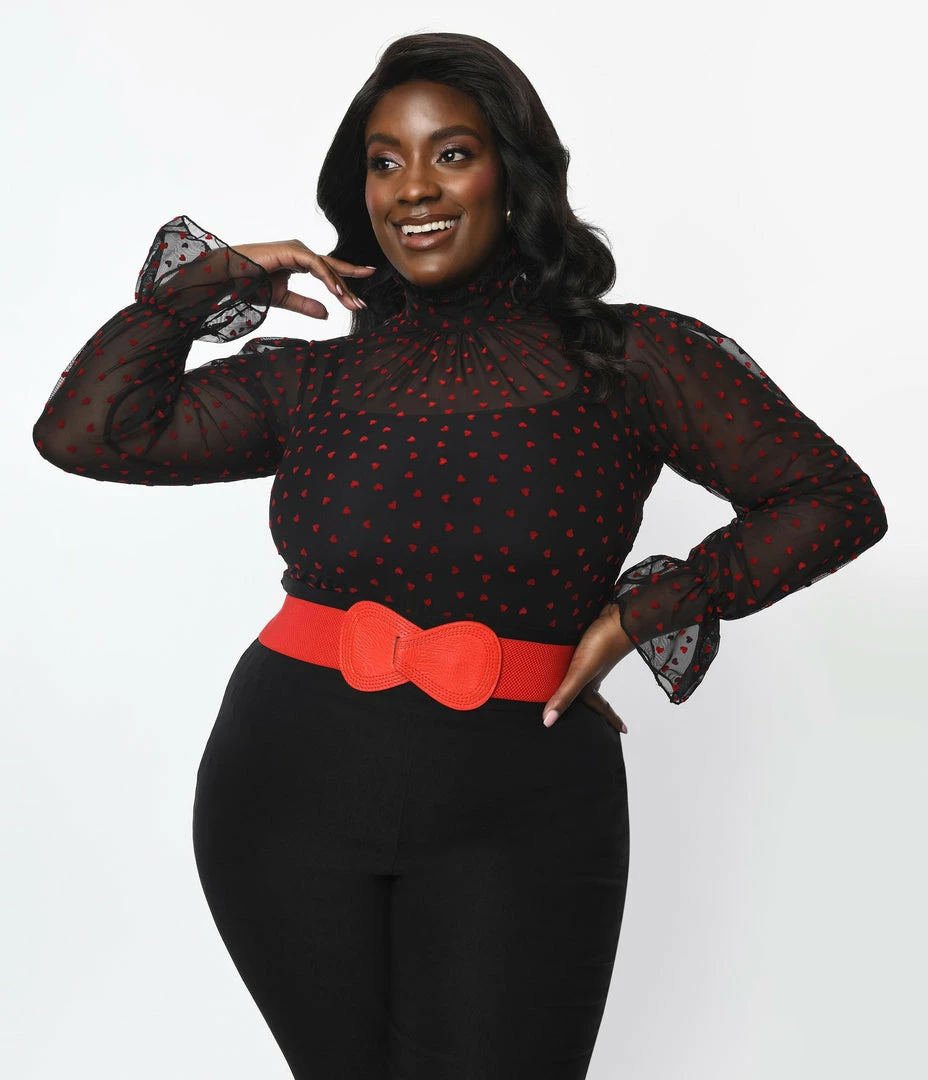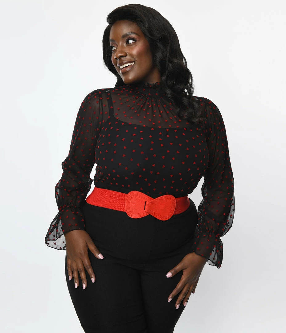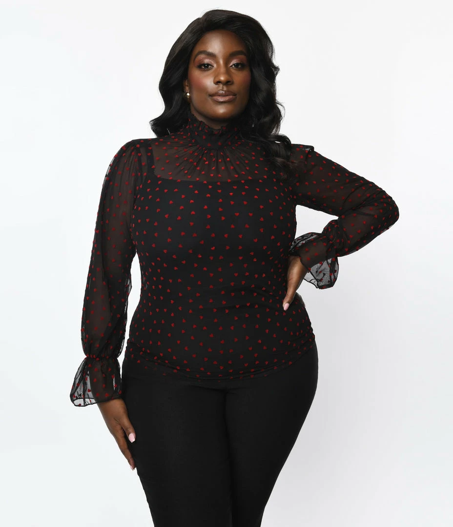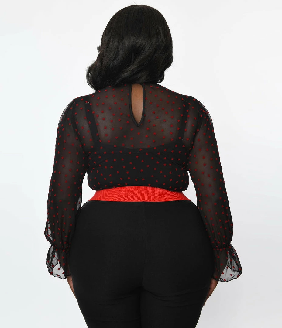 Discount โจ Unique Vintage Plus Size Black & Red Heart Dot Sheer Donna Blouse ๐