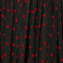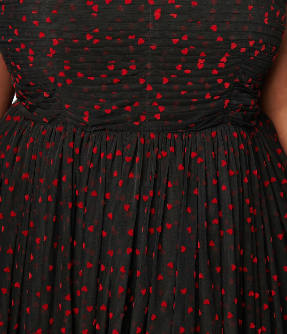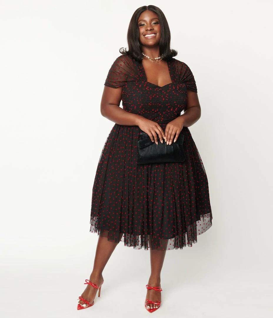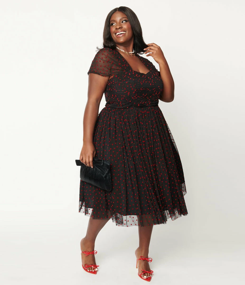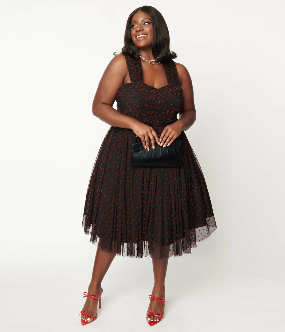 This romantic plus size swing dress is crafted in black mesh and dances with red Swiss hearts. Outfitted with built in padding, boning, and tulle layer while a back zipper completes this vintage charmer!