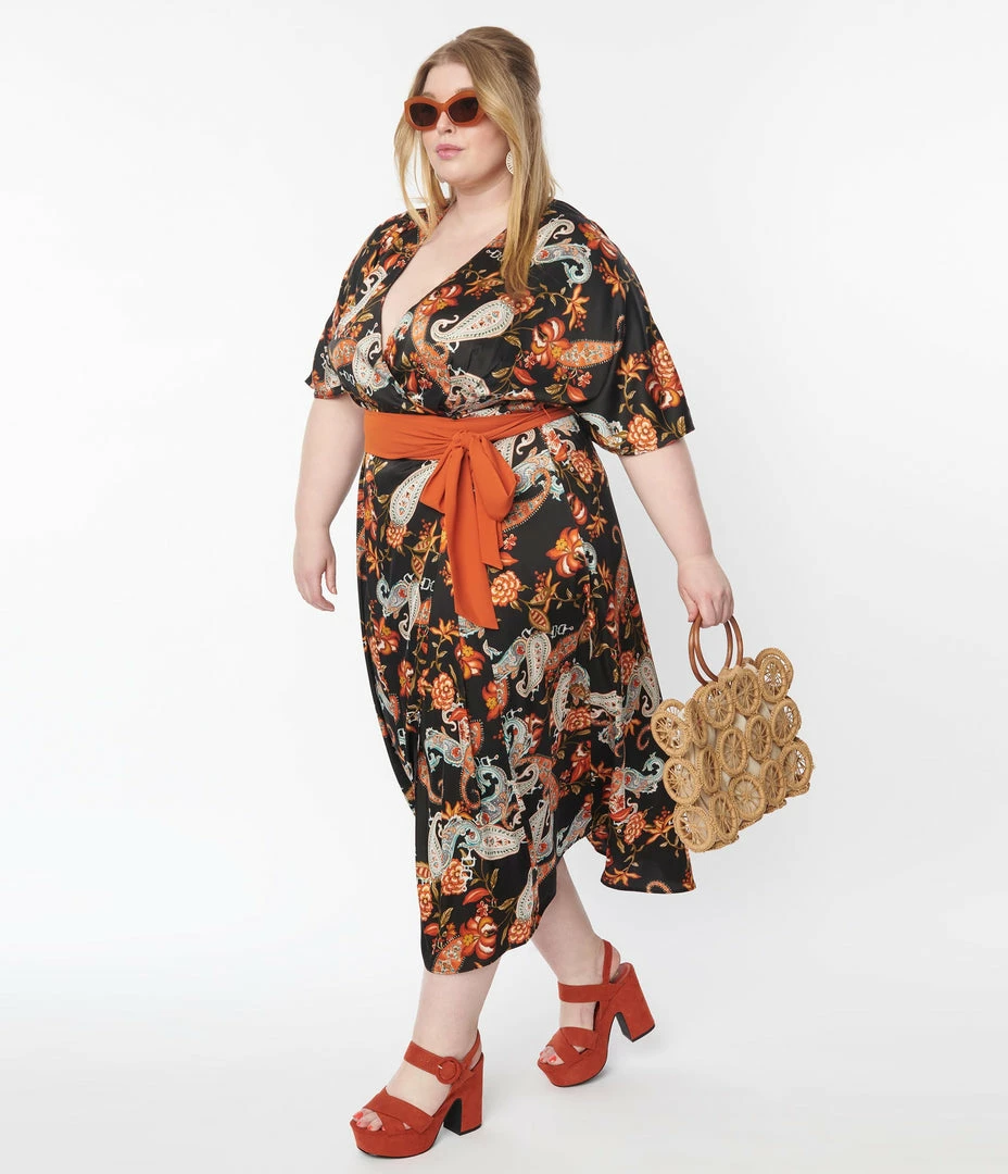 This marvelous plus size wrap dress is crafted in a gorgeous black satin-like fabric that dances with rust orange, cream, and teal paisley florals throughout. The wrap design is secured with dual buttons and is framed by dolman sleeves. The waist is cinched by an rust self tie sash while the midi length skirt dances below the knees.
