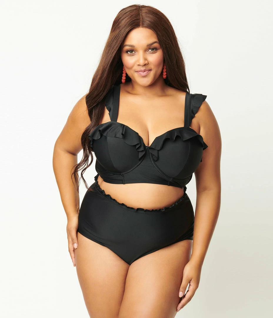 Bring some summer flourish to the pool, darling! This chic swim top from Unique Vintage is cast in solid black. The structured design provides plenty of support with molded cups, side boning, and underwire while the adjustable spaghetti straps and lace up back provide a flattering fit. Complete with a flirty ruffle along the neckline and straps, it’s your time to thrive!