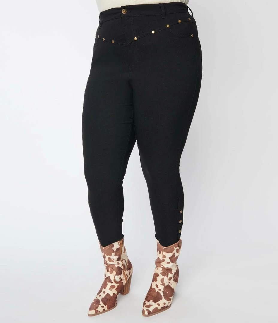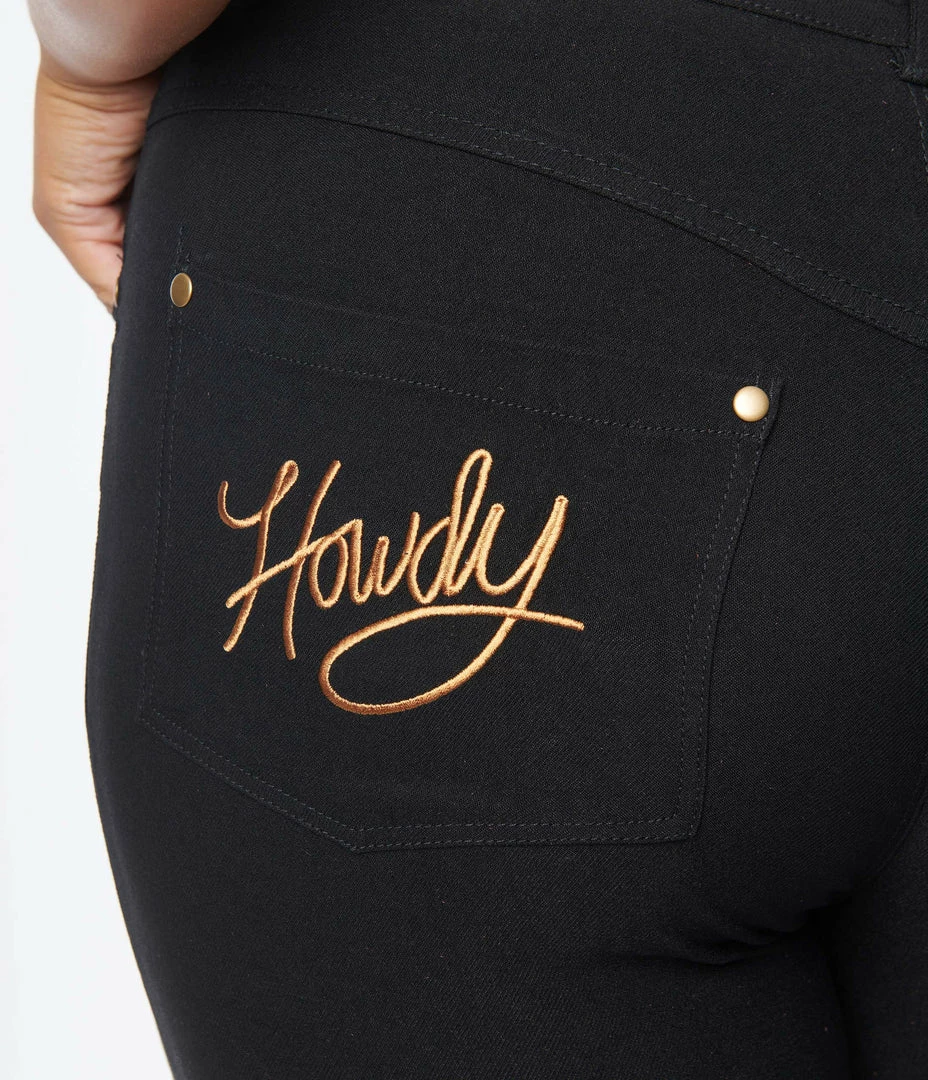 A retro pair of plus size pants crafted in black bengaline and boasting a fabulous high waist accented with a studs along the yoke inspired waist. Secured with a front zipper and button, the cigarette legs drop to your ankles, accented with studded snap buttons while side and back pockets lend modern function, embellished with an embroidered, โHowdy!โ on the back.
