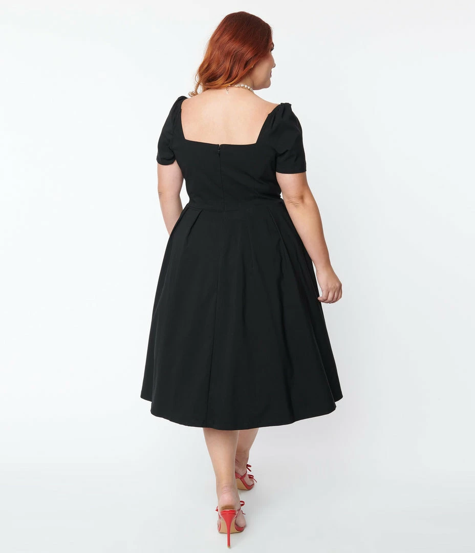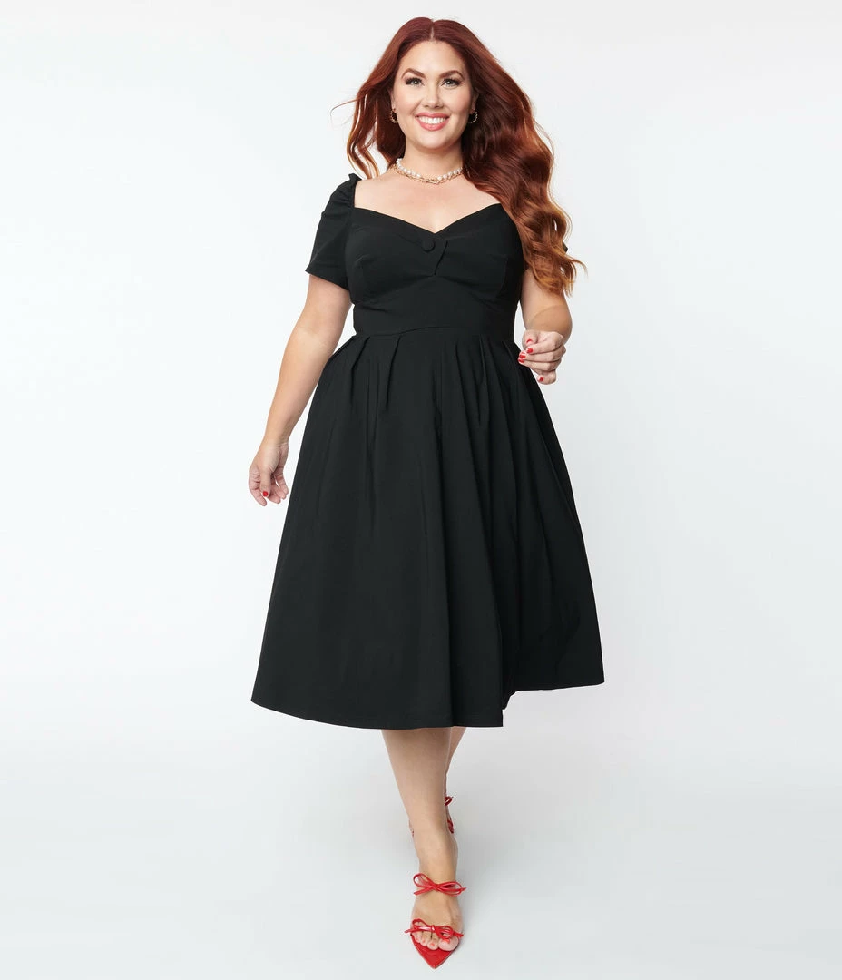 Youโre simply marvelous, darling! A fabulous plus size mid-century silhouette in bewitching black, the Midge Dress from Unique Vintage is a stunning addition to your retro wardrobe. Crafted in a divine stretch blend, the sultry sweetheart neckline tops a darted bodice with an adorable centerpiece of a faux button tab. The wide and pointed waistband slims and elongates your hourglass while the sweet short sleeves are topped by an elastic band for an off the shoulder look. The sweeping swing skirt features pleating along the waist that cascade to the straight hemline. Outfitted with a back zipper, youโve got what it takes!