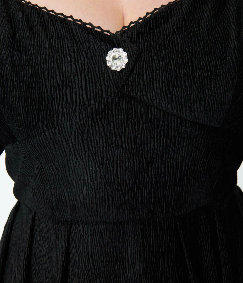 The plus size Lamar Dress is cast in a beautiful black textured velvet. The stunning sweetheart neckline features a sparkling rhinestone faux button. Outfitted with a back zipper and side pockets.