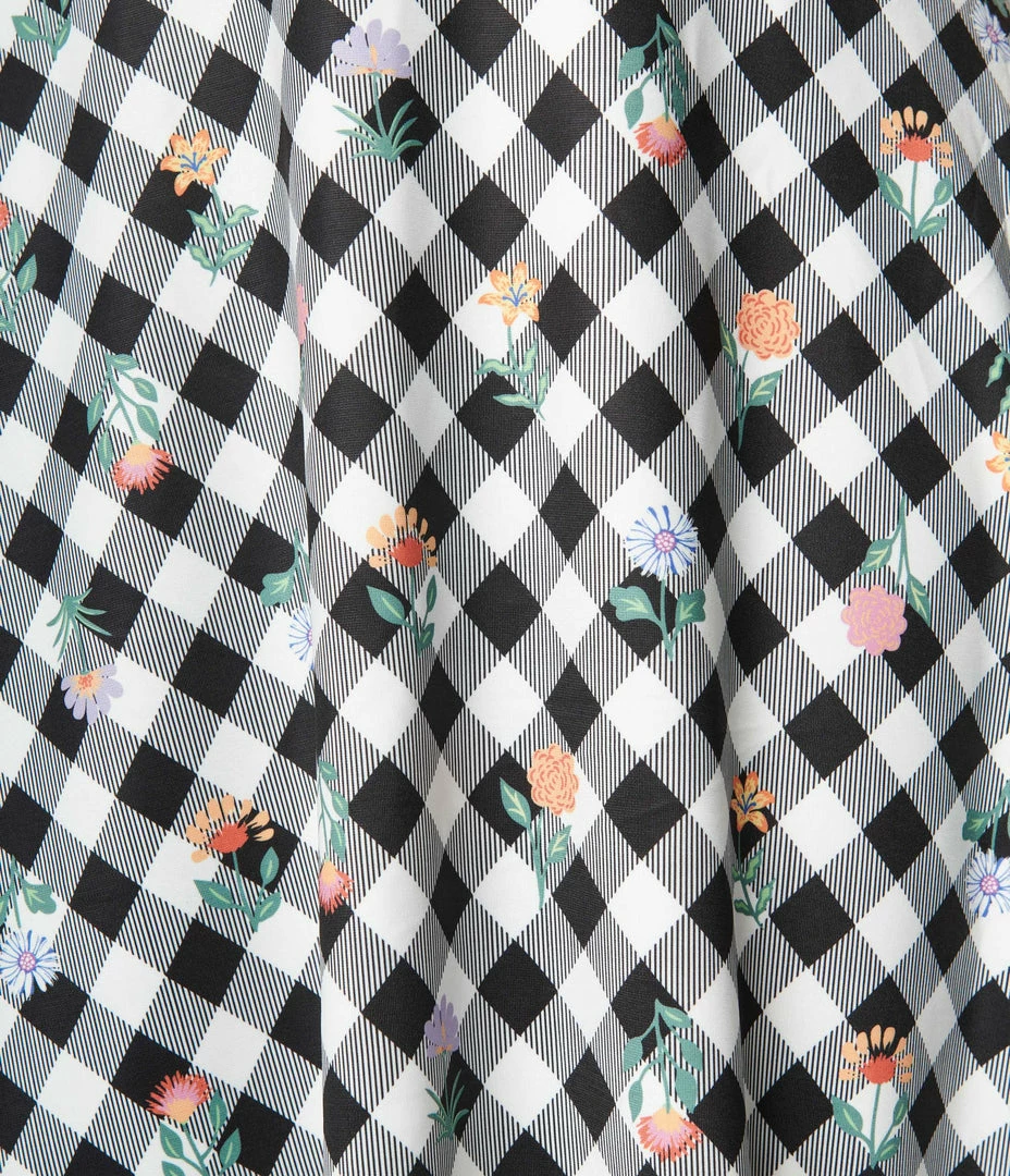 This adorable swing dress is crafted in a lightweight woven fabric. The white bodice boasts a flounce neckline, while the full swing skirt dances with a black and white gingham print and florals throughout.