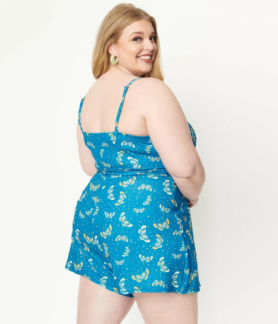 Flash Sale 🤩 Unique Vintage Plus Size Blue & Butterfly Print Lottie Wrap Romper 🥰