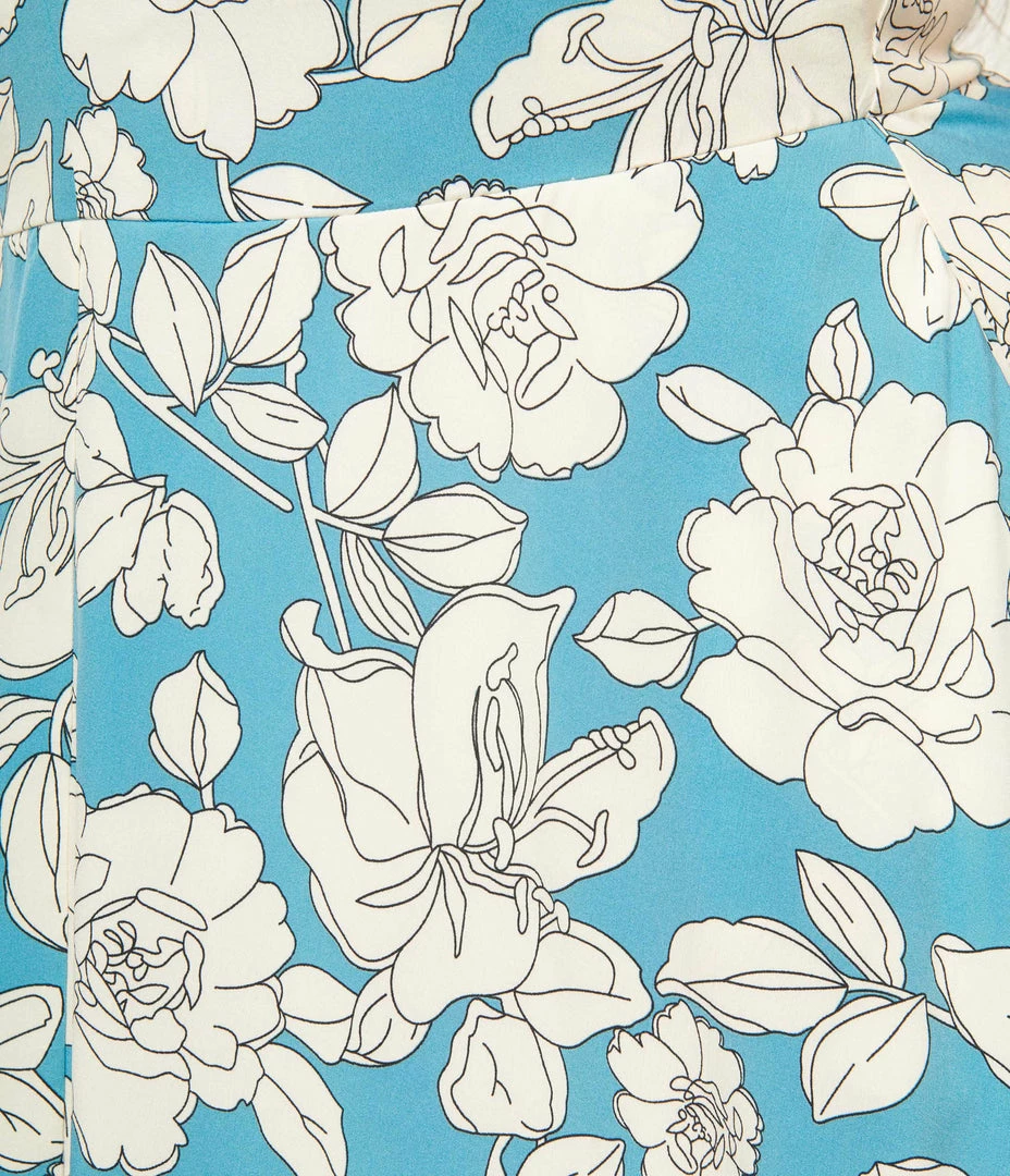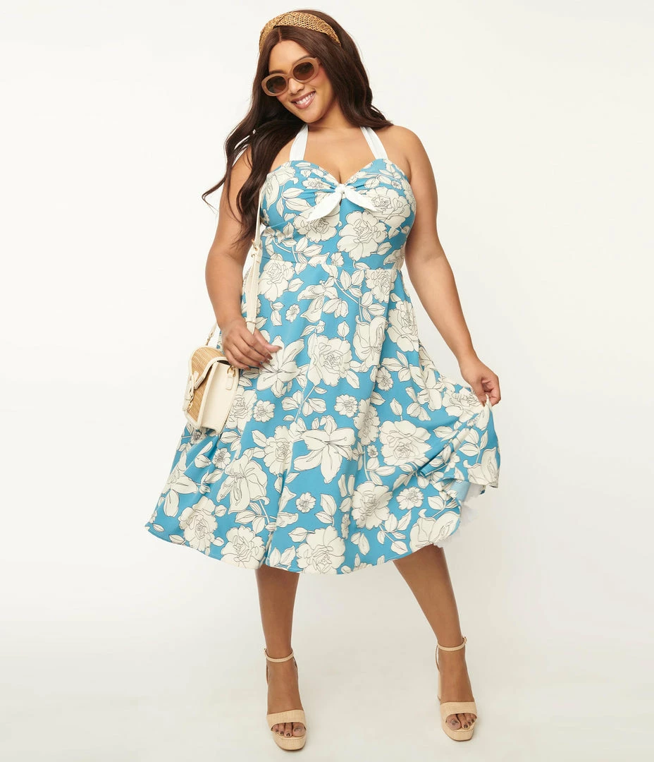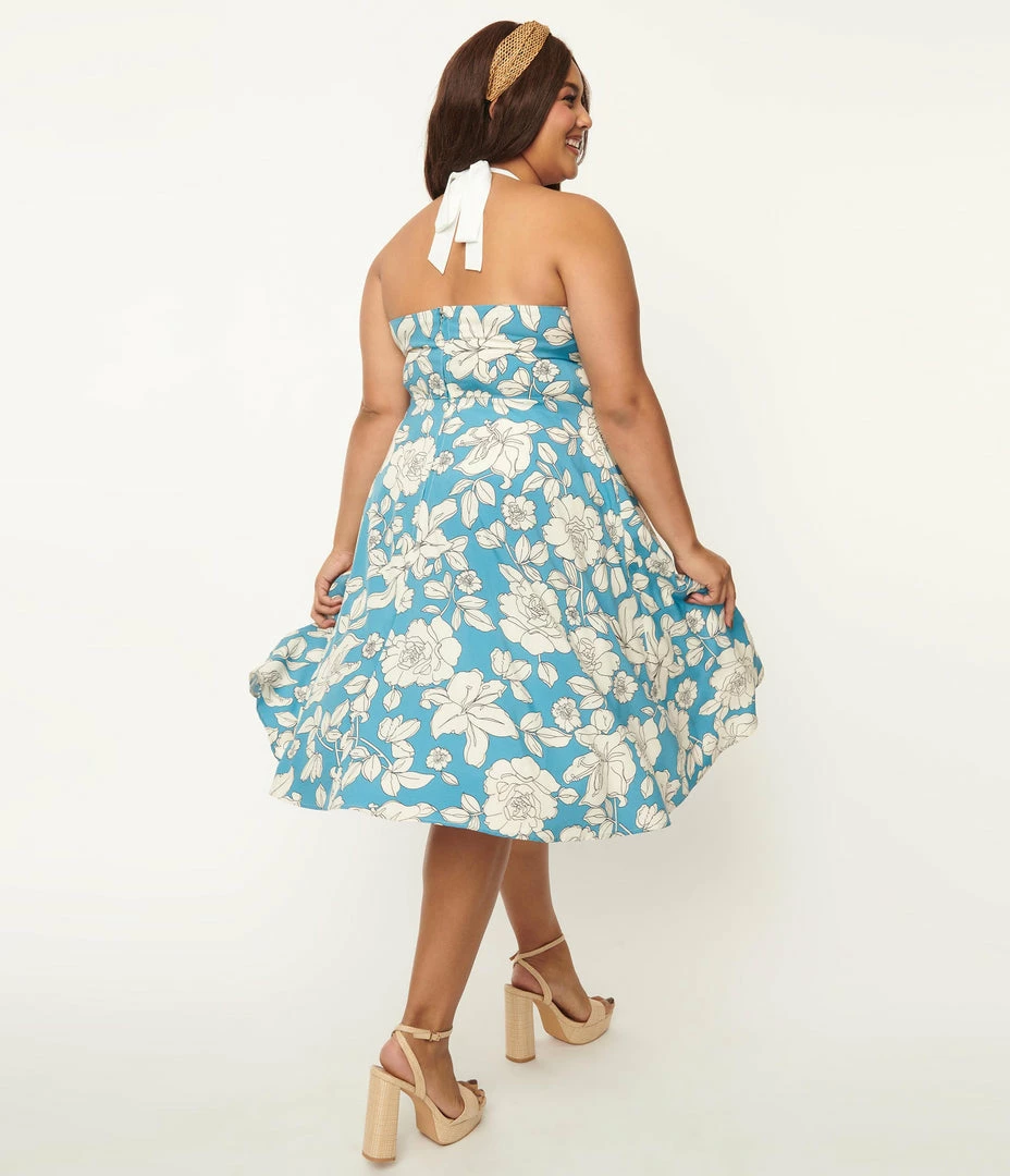 A heart-stopping plus size swing dress, crafted in a lightweight woven fabric that dances with a bouquet of white florals throughout the blue backdrop. Outfitted with a self tie halter, a back zipper, and side pockets.