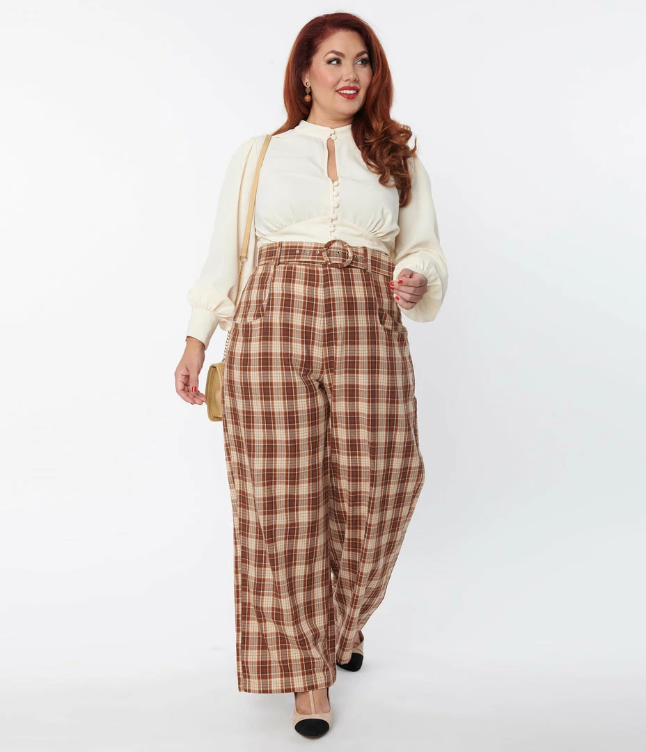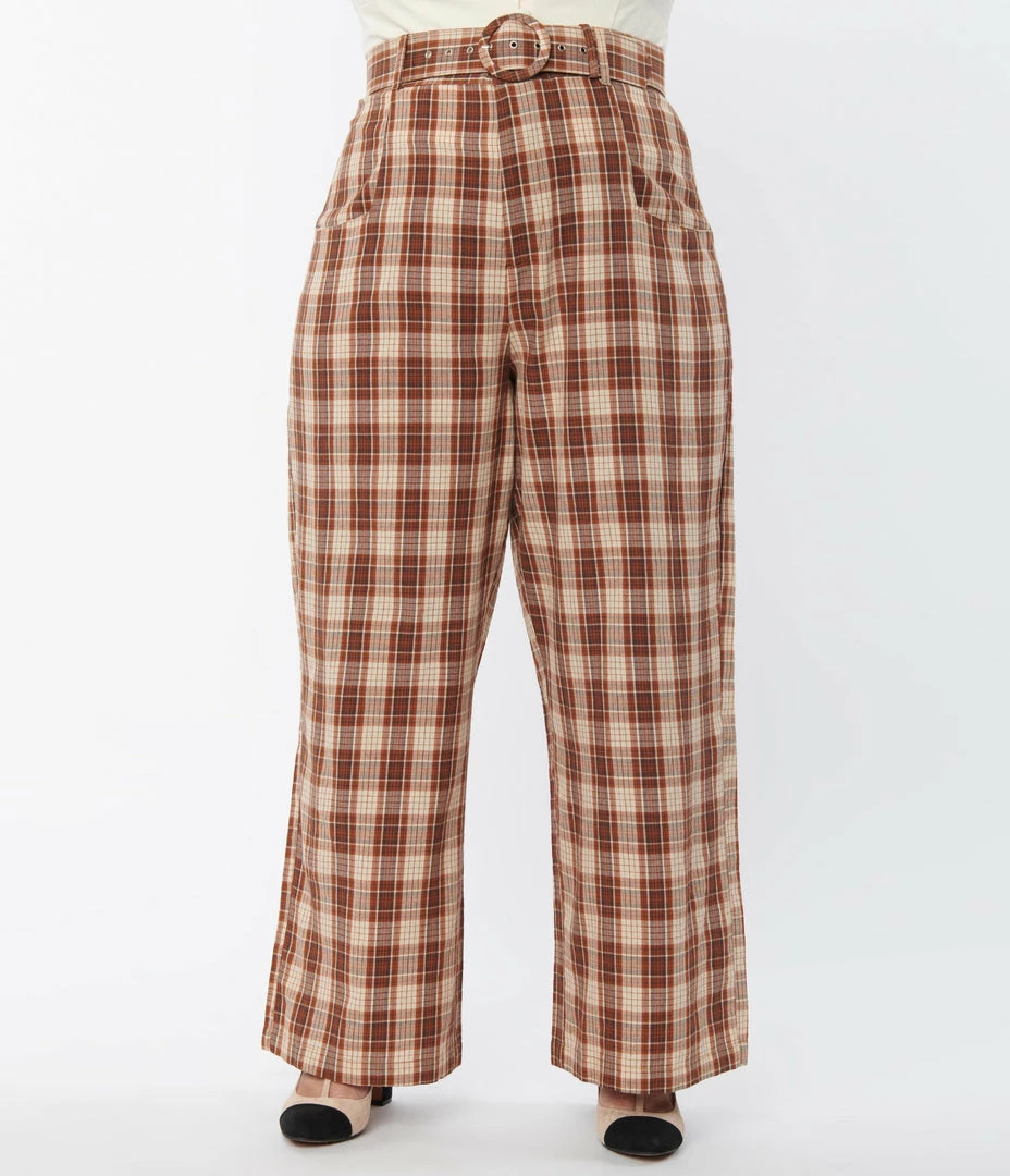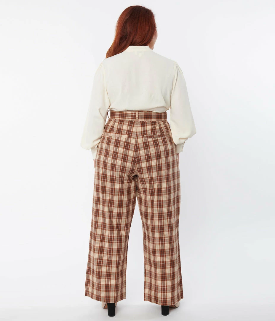 The plus size Ginger Pants are crafted in a lightweight woven that dances in brown and orange plaid.. The high waisted silhouette is accented with wide legs to create a retro silhouette that flatters. Complete with front zipper, side pockets, and matching belt.