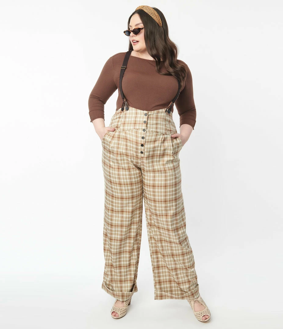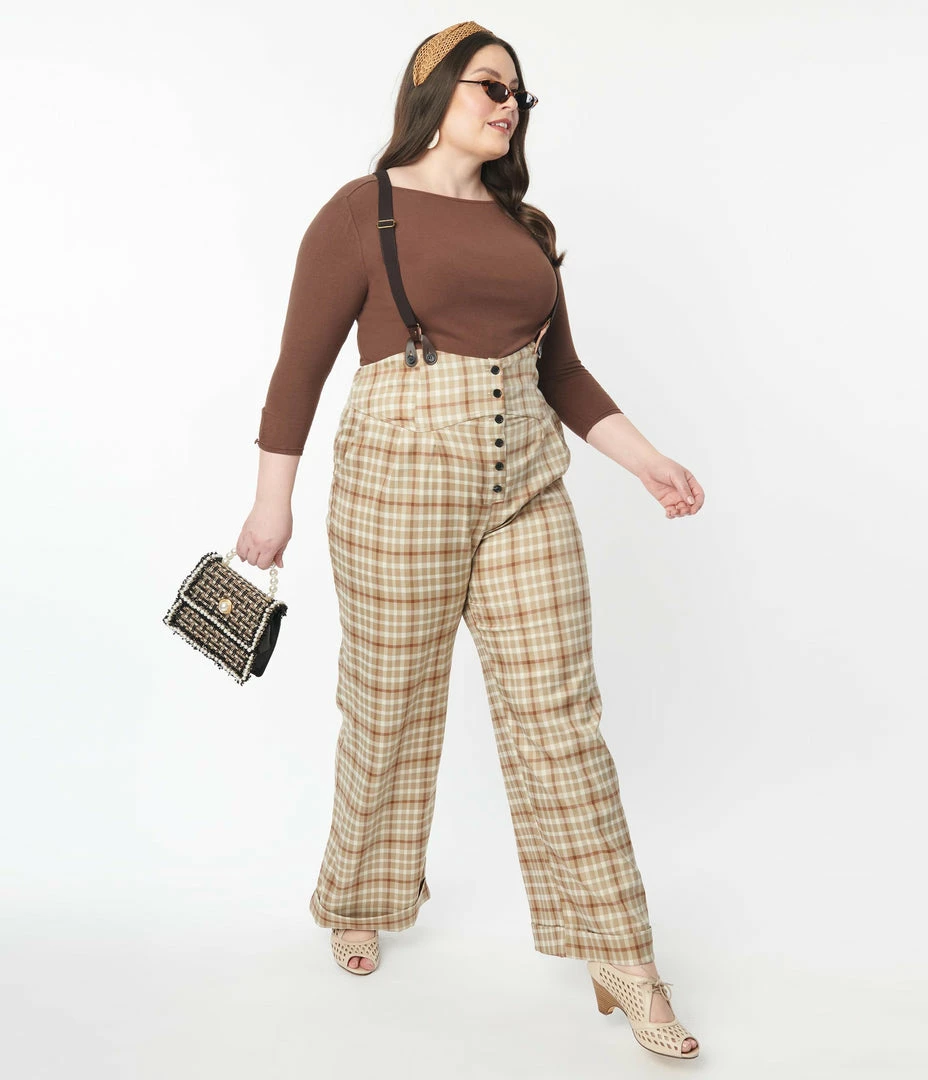 Discount ๐งจ Unique Vintage Plus Size Brown Plaid Thelma Suspender Pants ๐