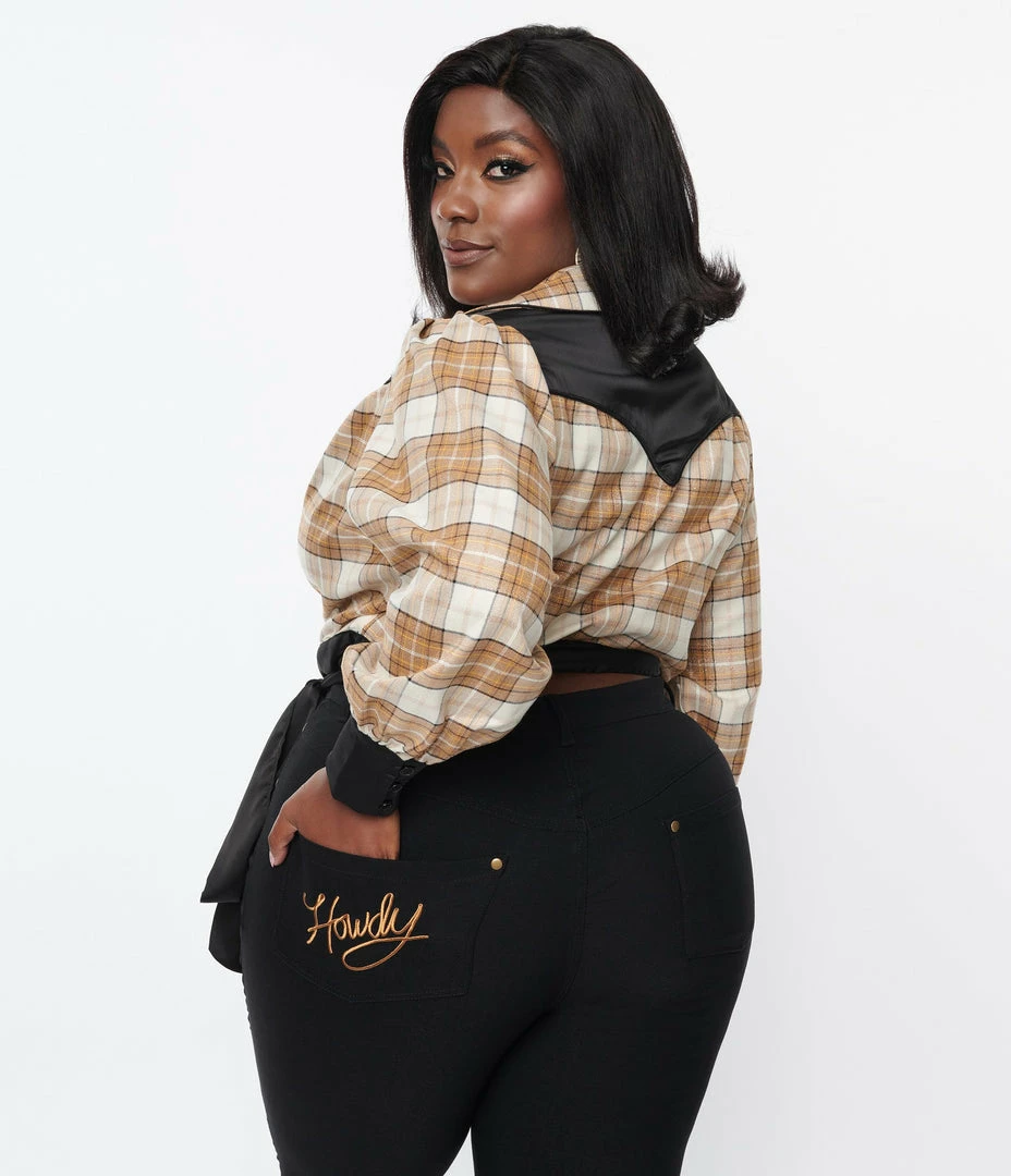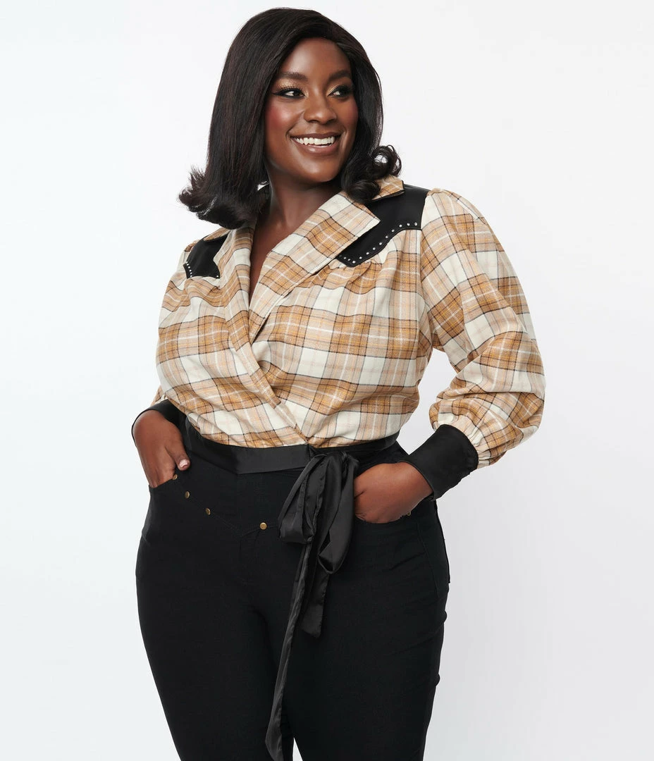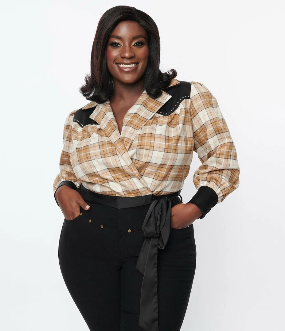 Wholesale 🎁 Unique Vintage Plus Size Brown Sparkle Plaid Western Wrap Crop Top Clothing 😉
