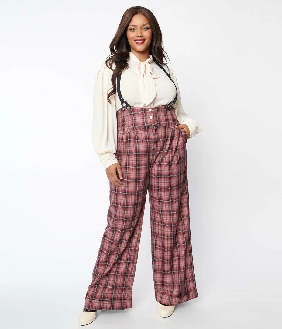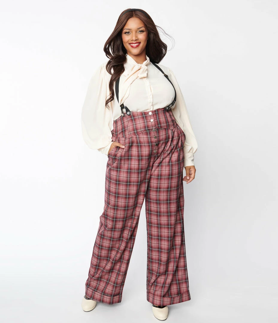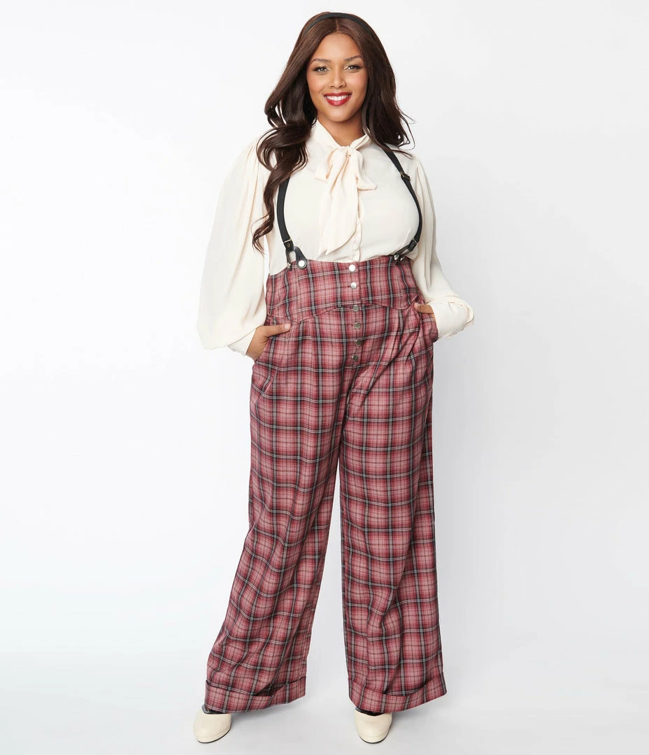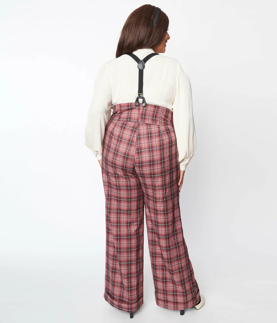 Cheap โญ Unique Vintage Plus Size Burgundy & Grey Plaid Thelma Suspender Pants ๐