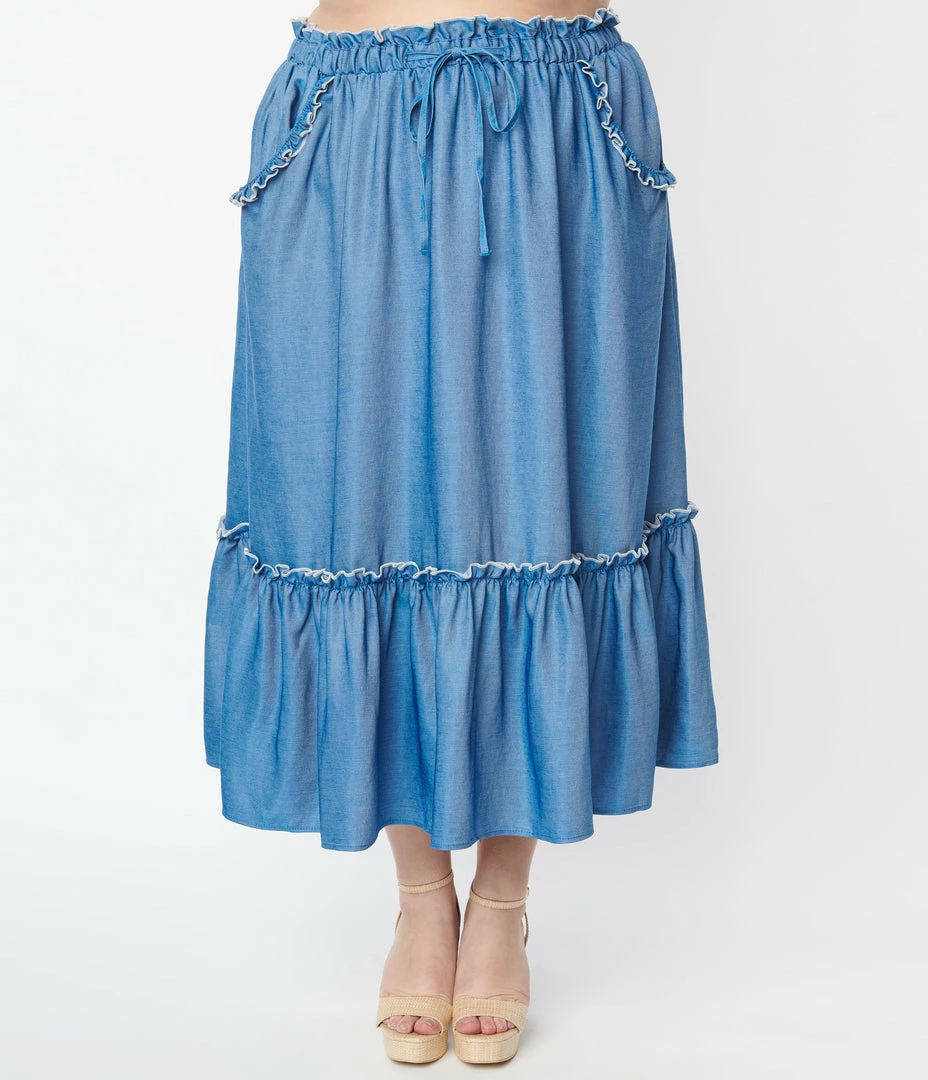 Cheapest 🤩 Unique Vintage Plus Size Chambray Ruffle Tiered Midi 👗 Skirt Sale 🌟