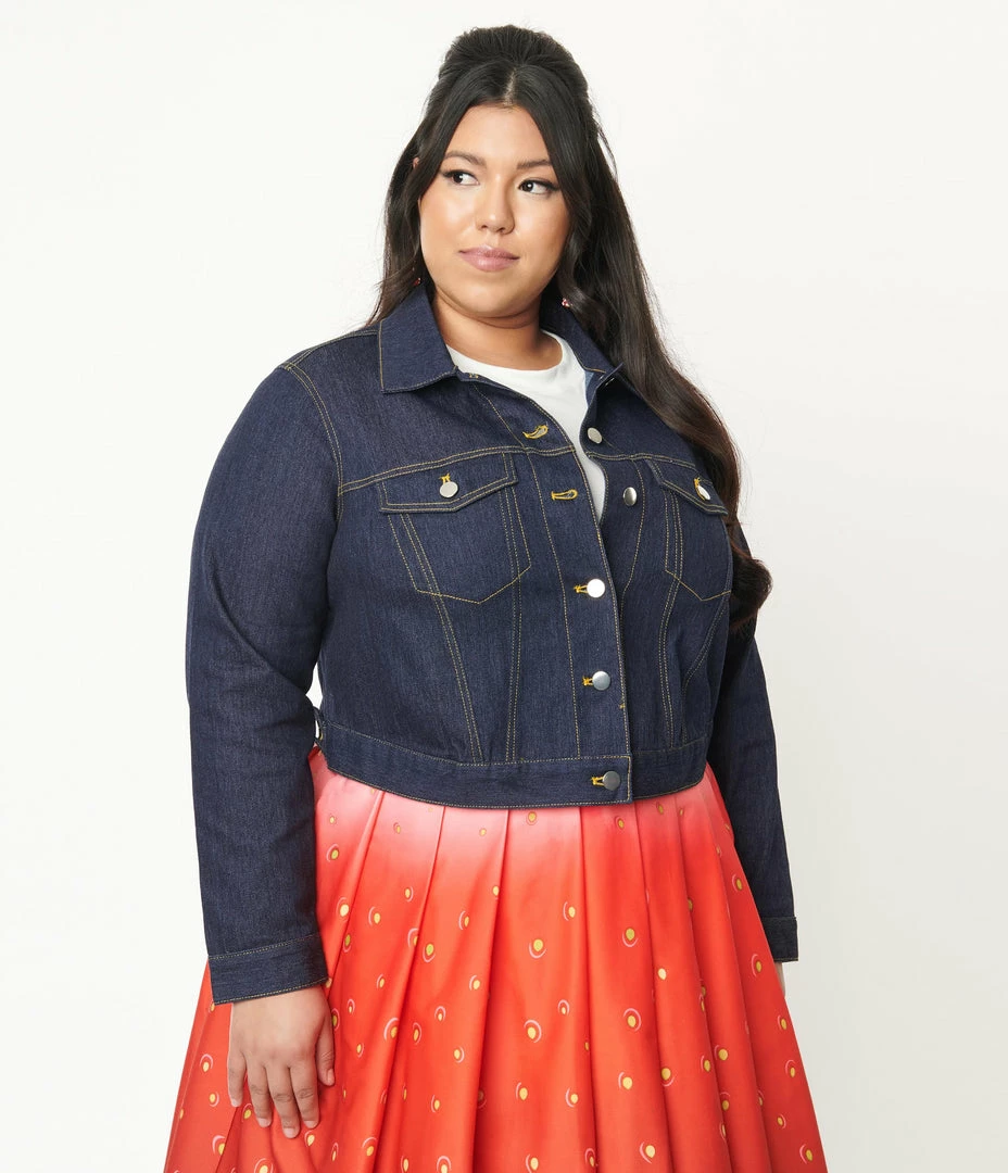 Button up in retro style, babe! The plus size Rhythm & Blue Jean Jacket from Unique Vintage brings a classic jean jacket to your style. Crafted in a medium wash denim with contrast stitching, the front flap pockets give you plenty of room to keep your necessities. A button up front and button cuffs complete this traditional everyday style. Roll the sleeves or pop the collar for a little extra flare!