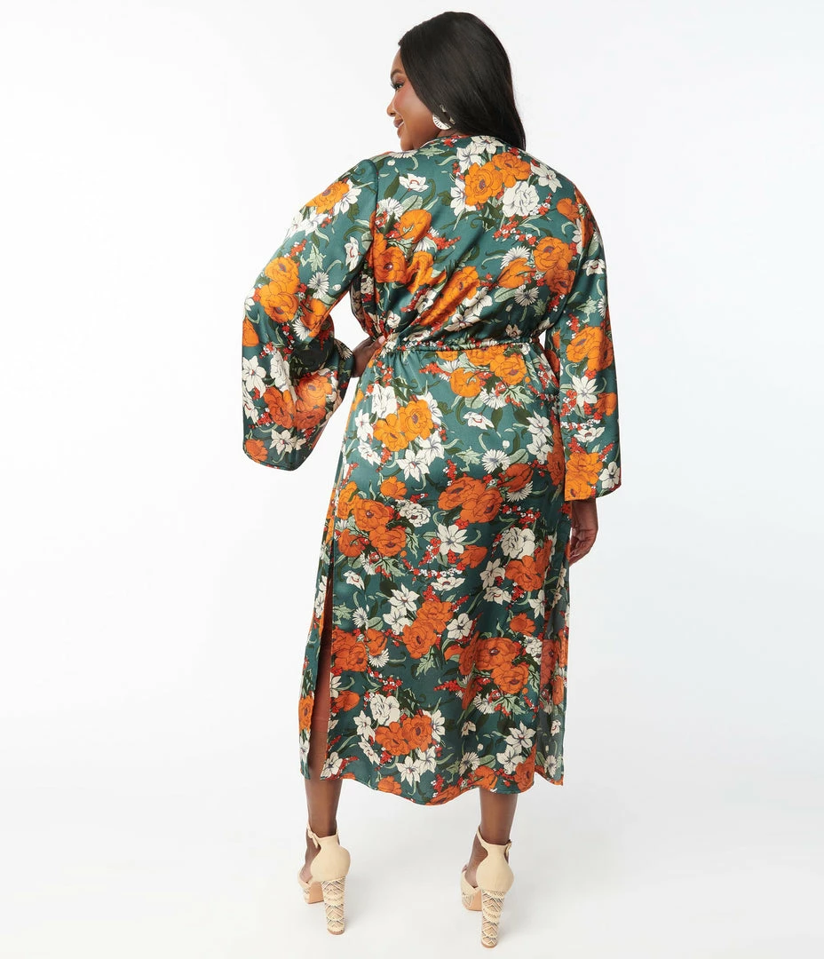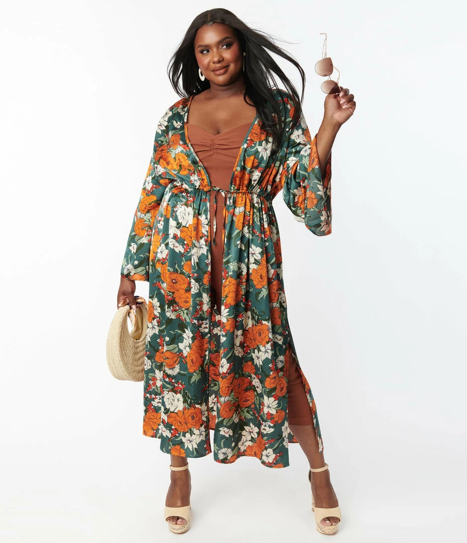 Top 10 ๐งจ Unique Vintage Plus Size Dark Green & Orange Floral Long Sleeved Kimono ๐ฏ