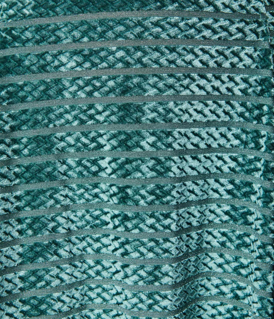 This sweet plus size flare dress is crafted in a dusty blue velvet that features a Devore striped pattern that sparkles with metallic threading. Complete with a back zipper and elastic cuffs.