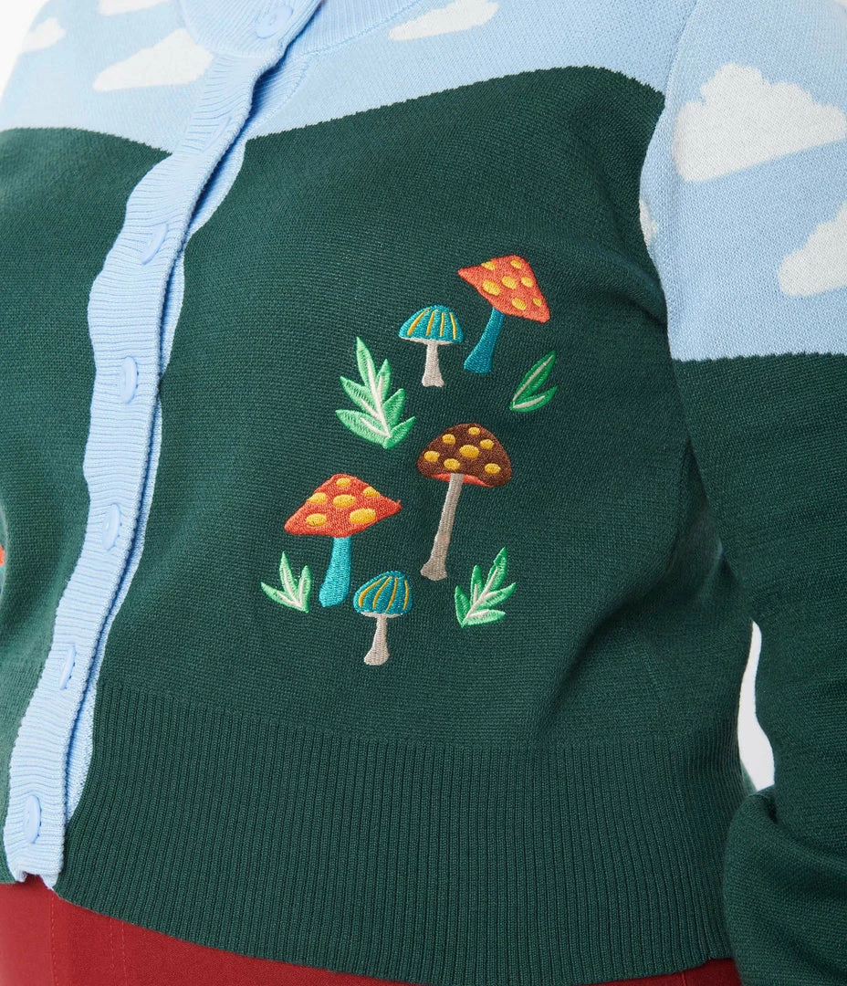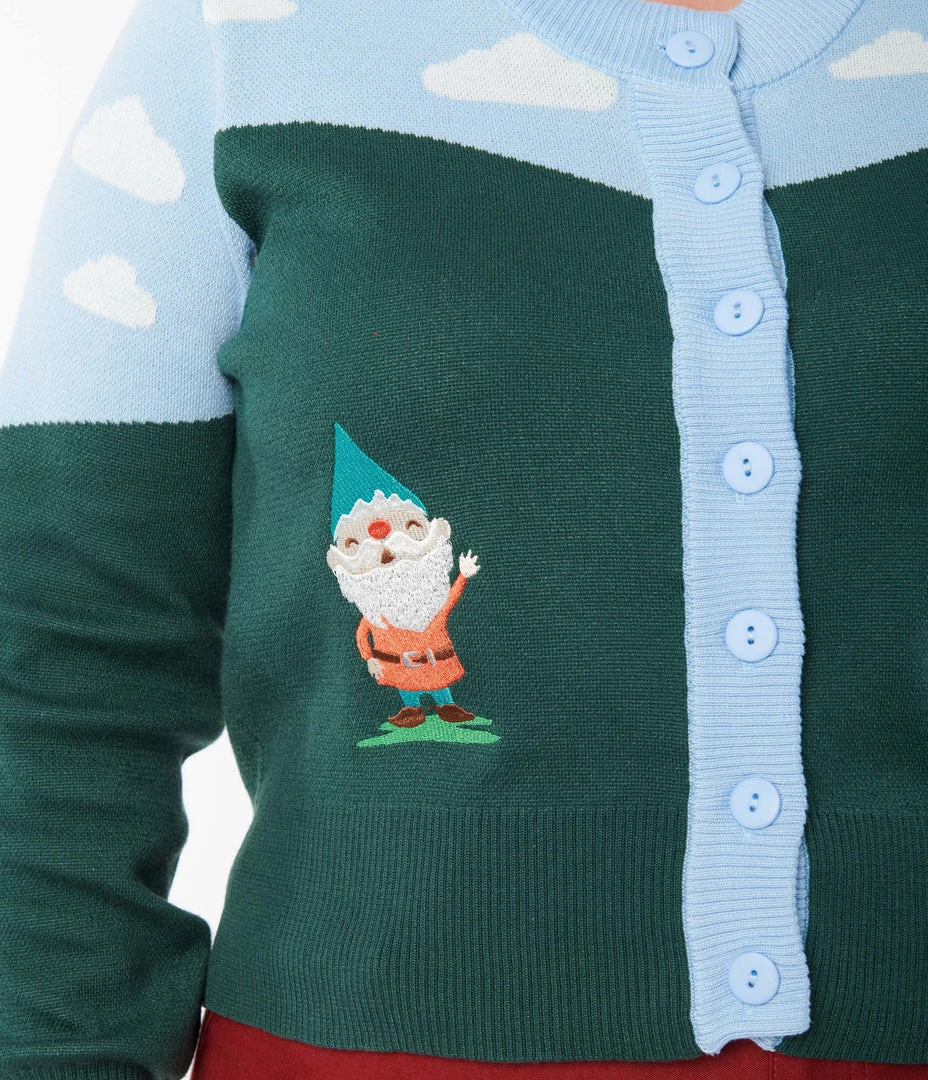 Crafted in a soft sweater knit this plus size cardigan boasts a sweet blue sky with clouds yoke and garden gnome embroidery throughout the green bodice. Complete with button front, scoop neck, and cozy long sleeves.