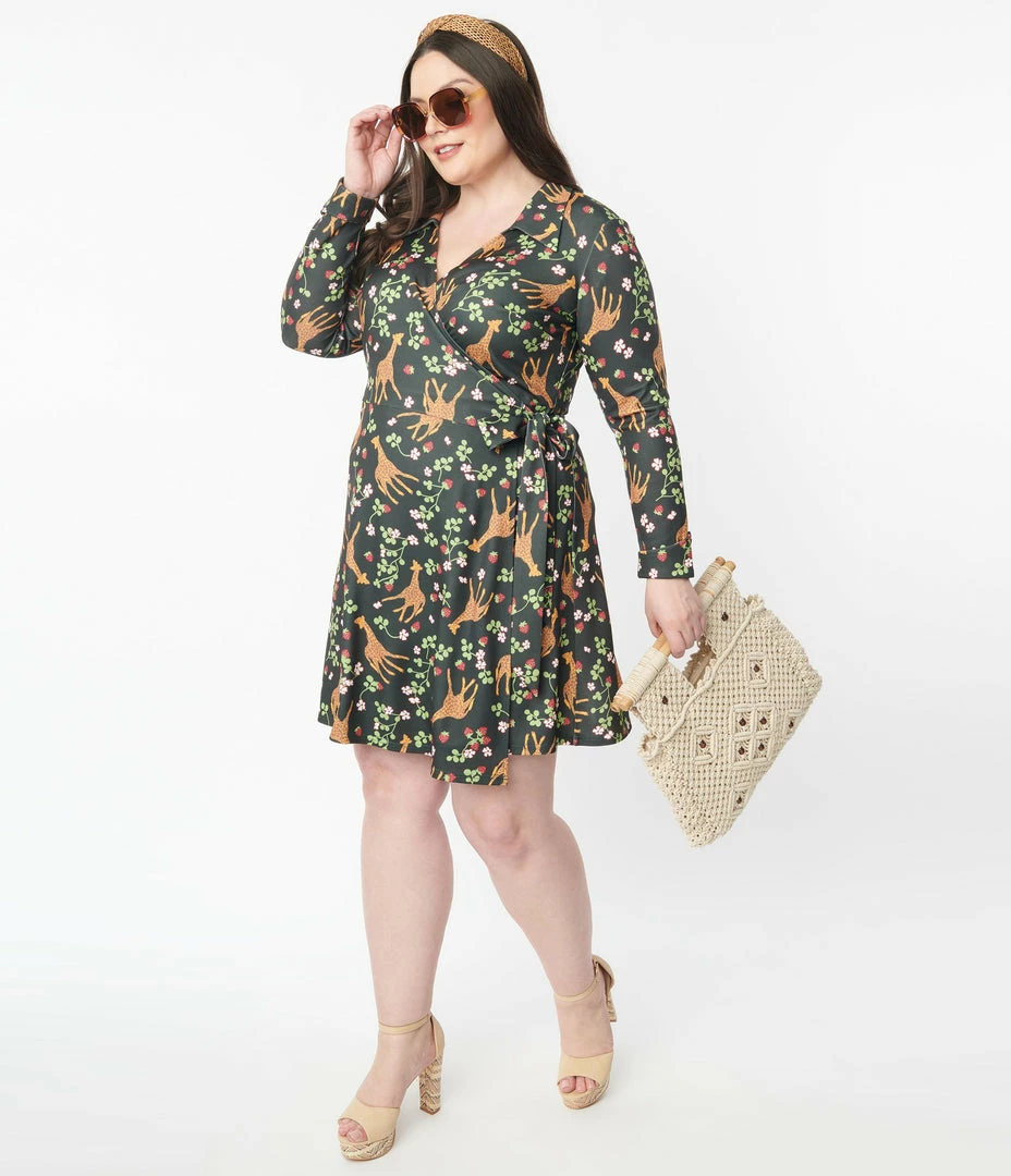Discount ⌛ Unique Vintage Plus Size Green Giraffe & Strawberry Print Wrap 👗 Dress 🎉