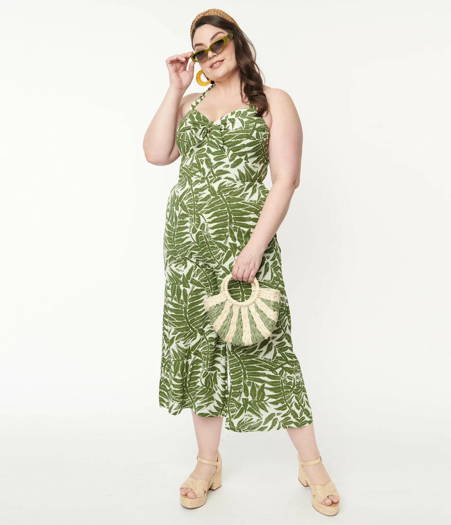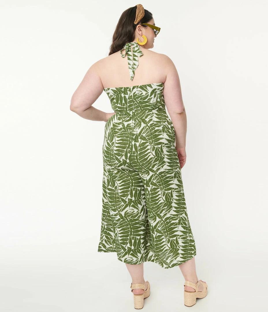 Best Pirce ๐งจ Unique Vintage Plus Size Green Tropical Print Halter Jumpsuit ๐