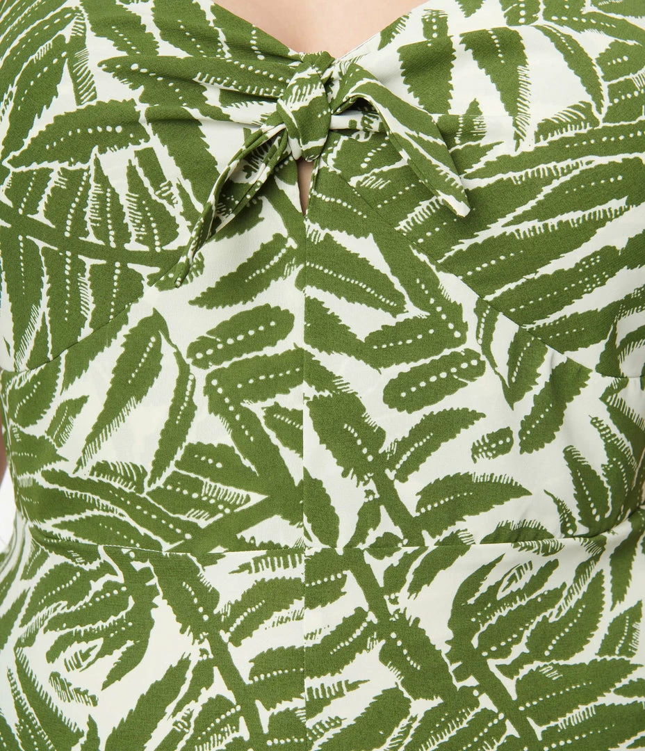 This lightweight plus size jumpsuit is crafted in a smooth woven fabric that dances with a gorgeous tropical pattern in green palm leaves. Outfitted with a self tie halter, back zipper, and side pockets.