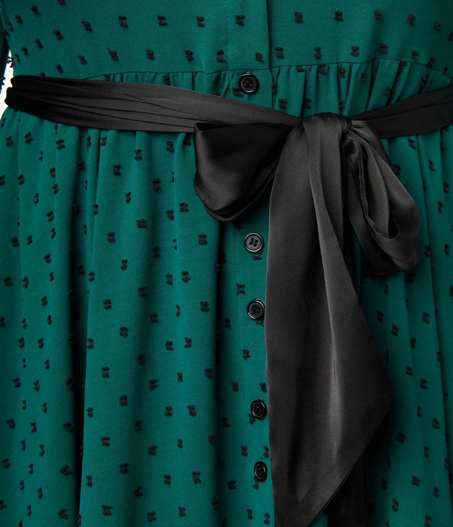 A charming plus size shirtdress crafted in a sturdy woven hunter green fabric that dances with black clip dots throughout. Outfitted with a button up front, button cuffs, and a sash. Complete with side pockets.