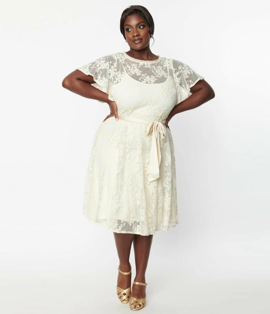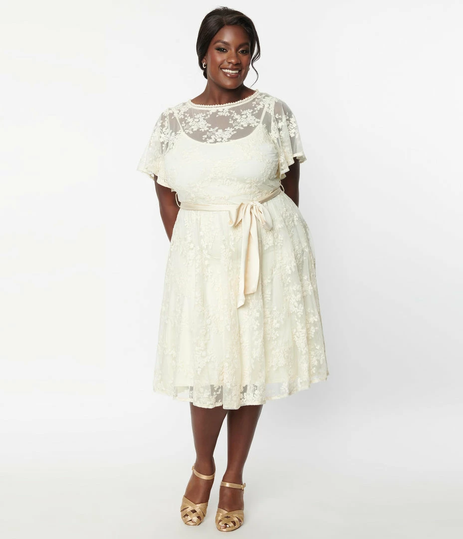 This ethereal plus size swing dress is crafted in an ivory white lace that dances with florals over a matching lining. The illusion scoop neckline is secured by a back button keyhole and framed by sweet short sleeves, while the full swing skirt is nipped in by a self tie sash!