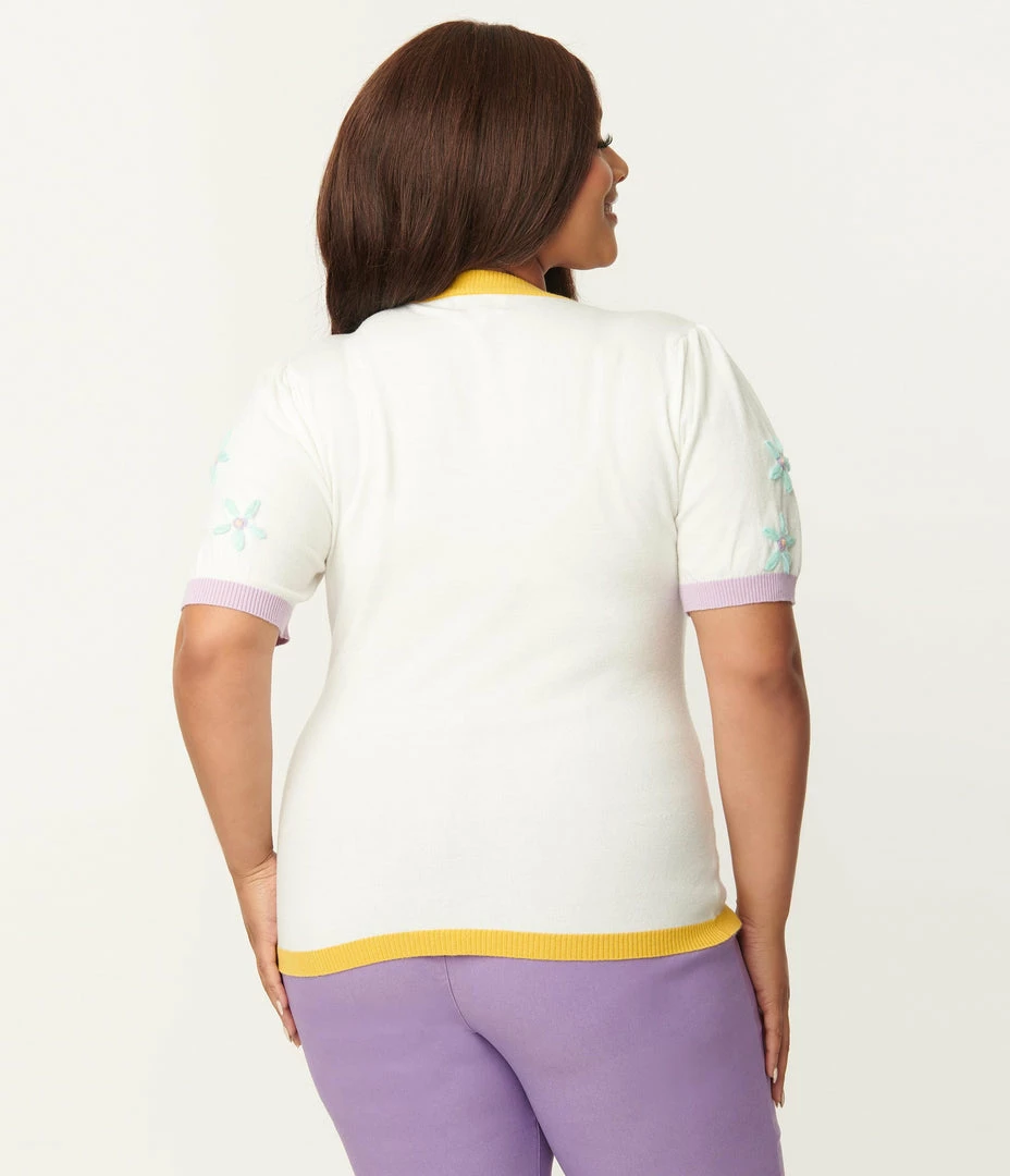This ivory white plus size cardigan is crafted in a soft sweater knit and features embroidered florals, a mustard yellow button up front, hem, and modest scoop neckline, framed by short sleeves with purple cuffs and complete with purple front pockets.