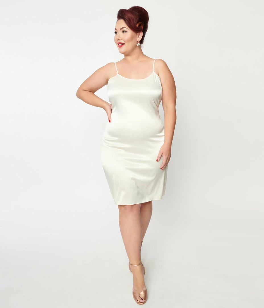 This sultry plus size slip is crafted ivory satin-style fabric, featuring adjustable spaghetti straps.