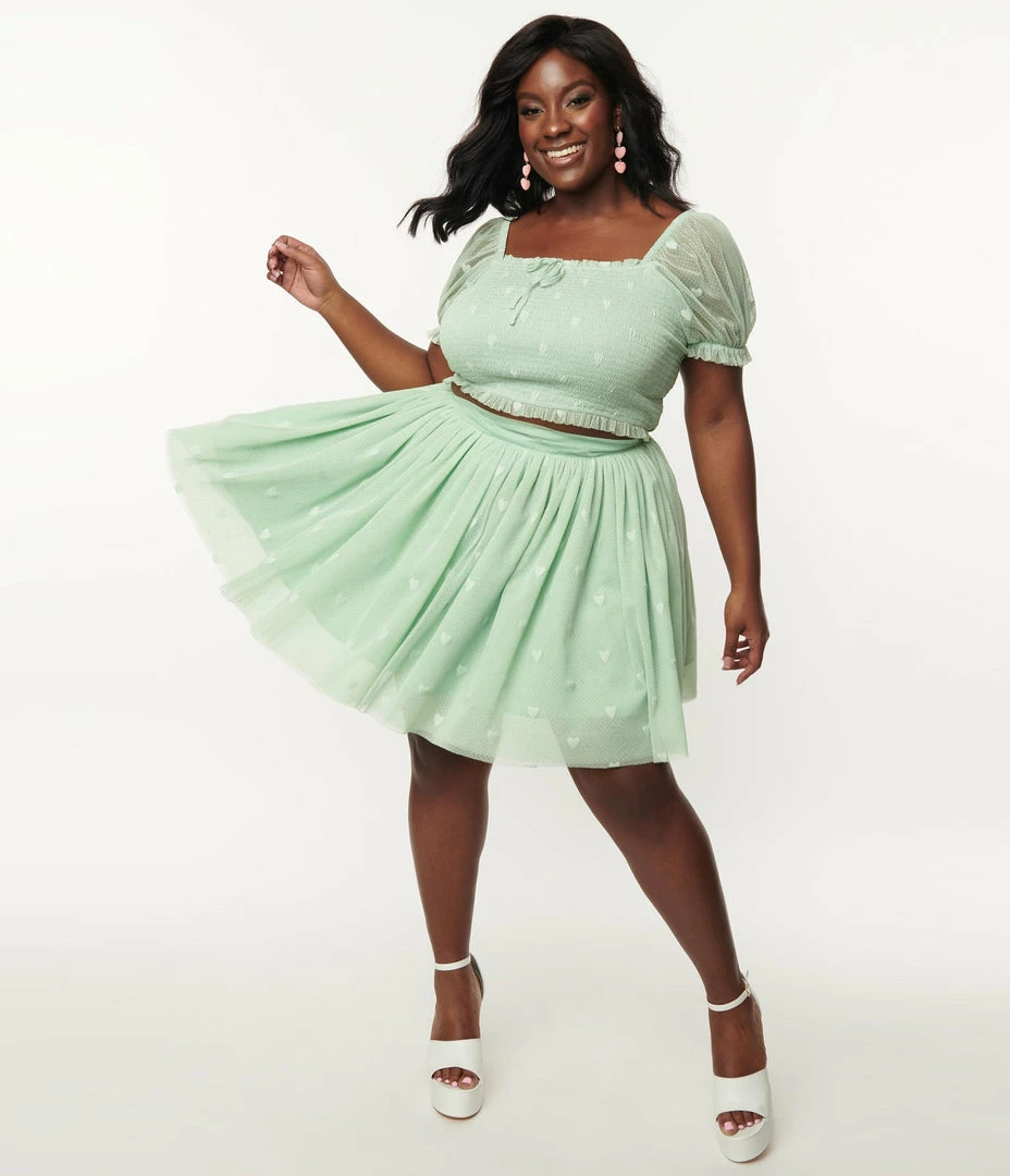 Grab a slice or two, dames! This adorable plus size separate from Unique Vintage dances with swiss dots and hearts throughout the mint mesh. The Sweetie Pie Skirt features a high banded waist, cinched with a back zipper while layers of mesh and mint tulle cascade over mint lining and dances high above your knees, complete with hidden side pockets for modern function!
