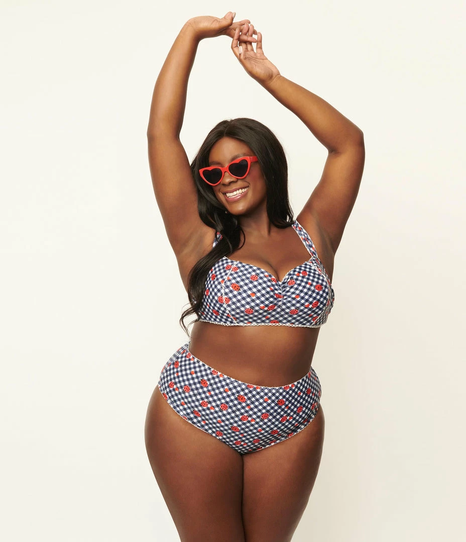 Vintage swim at its absolute best, the Plus Size Daphne Swim Bottoms from Unique Vintage are retro swim perfection! A print of red ladybugs and hearts dance throughout that beautiful navy blue and white gingham backdrop that stands out in vintage vibrance in fully mesh lined comfort and trimmed in white lace scallops. Take things to flirty vintage heights this summer, gals!